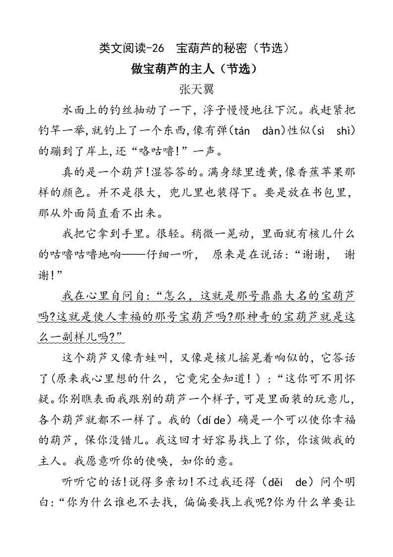 当前位置: 首页小学资源小学四年级正文 四年级语文下册类文阅读-26宝葫芦的秘密(节选)_共5页 小学四年级 1 周前 0 0 5 以上为部分内容预览,如需源文档请登录您的会员账号进行下载! 声明:本站所有文章,如无特殊说明或标注,均为本站原创发布。任何个人或组织,在未征得本站同意时,禁止复制、盗用、采集、发布本站内容到任何网站、书籍等各类媒体平台。如若本站内容侵犯了原著者的合法权益,可联系我们进行处理。 尚学资源永久会员 打赏 收藏 海报 链接
