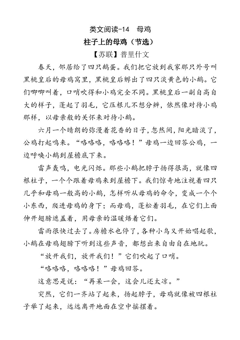 当前位置: 首页小学资源小学四年级正文 四年级语文下册类文阅读-14母鸡_共5页 小学四年级 7 天前 0 0 5 以上为部分内容预览,如需源文档请登录您的会员账号进行下载! 声明:本站所有文章,如无特殊说明或标注,均为本站原创发布。任何个人或组织,在未征得本站同意时,禁止复制、盗用、采集、发布本站内容到任何网站、书籍等各类媒体平台。如若本站内容侵犯了原著者的合法权益,可联系我们进行处理。 尚学资源永久会员 打赏 收藏 海报 链接