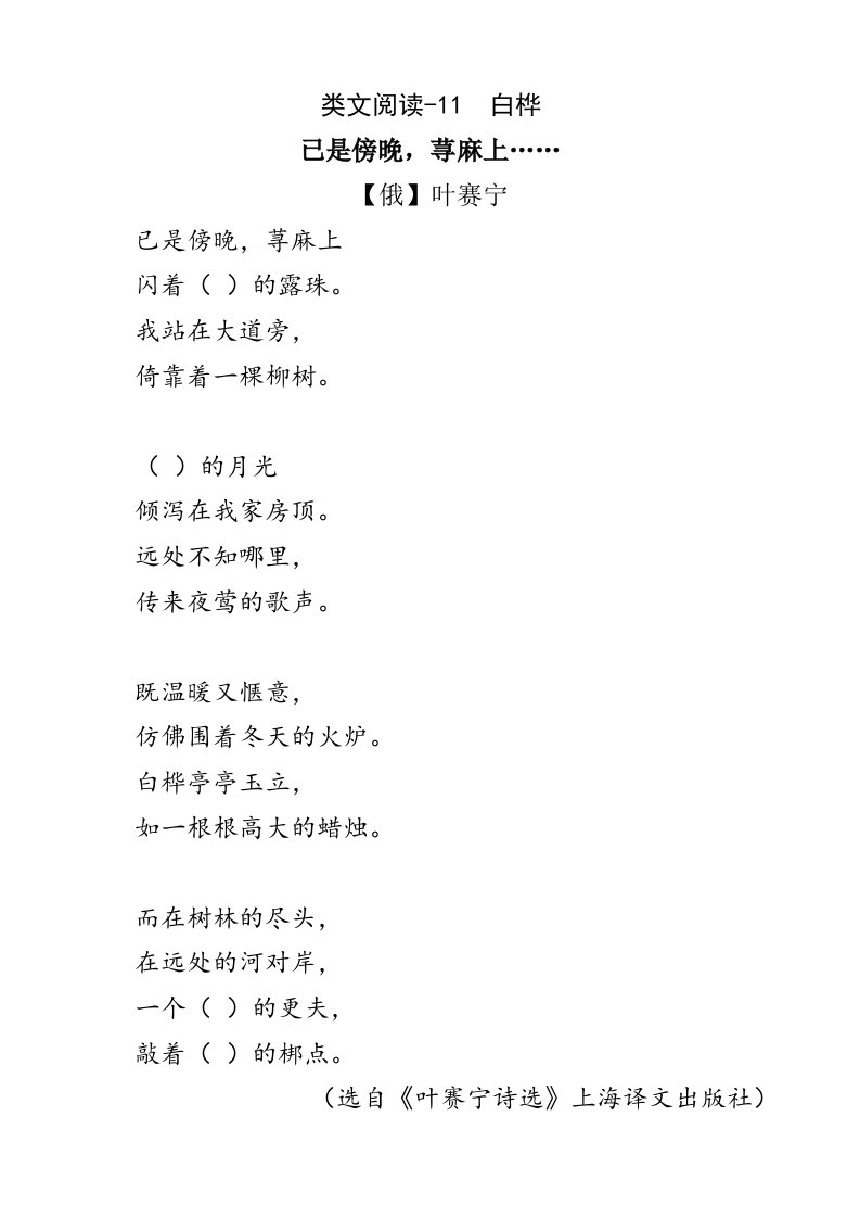 当前位置: 首页小学资源小学四年级正文 四年级语文下册类文阅读-11白桦_共5页 小学四年级 7 天前 0 0 5 以上为部分内容预览,如需源文档请登录您的会员账号进行下载! 声明:本站所有文章,如无特殊说明或标注,均为本站原创发布。任何个人或组织,在未征得本站同意时,禁止复制、盗用、采集、发布本站内容到任何网站、书籍等各类媒体平台。如若本站内容侵犯了原著者的合法权益,可联系我们进行处理。 尚学资源永久会员 打赏 收藏 海报 链接