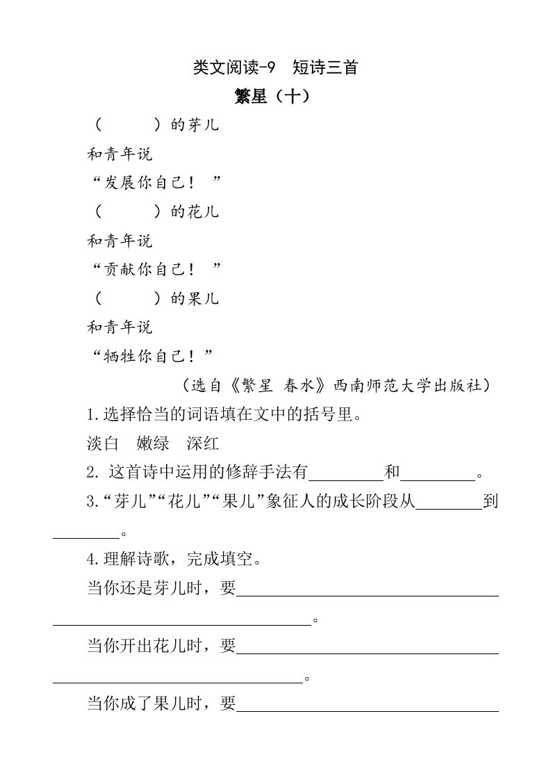 当前位置: 首页小学资源小学四年级正文 四年级语文下册类文阅读-9短诗三首_共3页 小学四年级 7 天前 0 0 5 以上为部分内容预览,如需源文档请登录您的会员账号进行下载! 声明:本站所有文章,如无特殊说明或标注,均为本站原创发布。任何个人或组织,在未征得本站同意时,禁止复制、盗用、采集、发布本站内容到任何网站、书籍等各类媒体平台。如若本站内容侵犯了原著者的合法权益,可联系我们进行处理。 尚学资源永久会员 打赏 收藏 海报 链接
