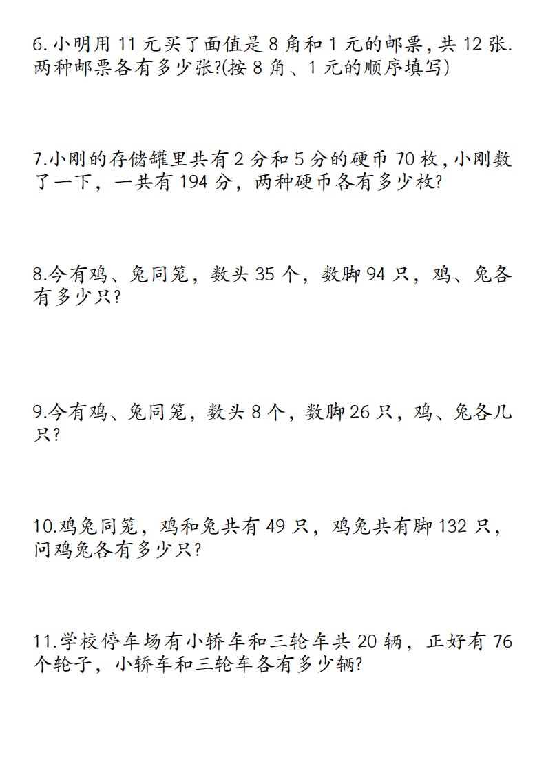 当前位置: 首页小学资源小学四年级正文 四下数学鸡兔同笼易错应用题50道_共21页 小学四年级 7 天前 0 0 15 以上为部分内容预览,如需源文档请登录您的会员账号进行下载! 声明:本站所有文章,如无特殊说明或标注,均为本站原创发布。任何个人或组织,在未征得本站同意时,禁止复制、盗用、采集、发布本站内容到任何网站、书籍等各类媒体平台。如若本站内容侵犯了原著者的合法权益,可联系我们进行处理。 尚学资源永久会员 打赏 收藏 海报 链接