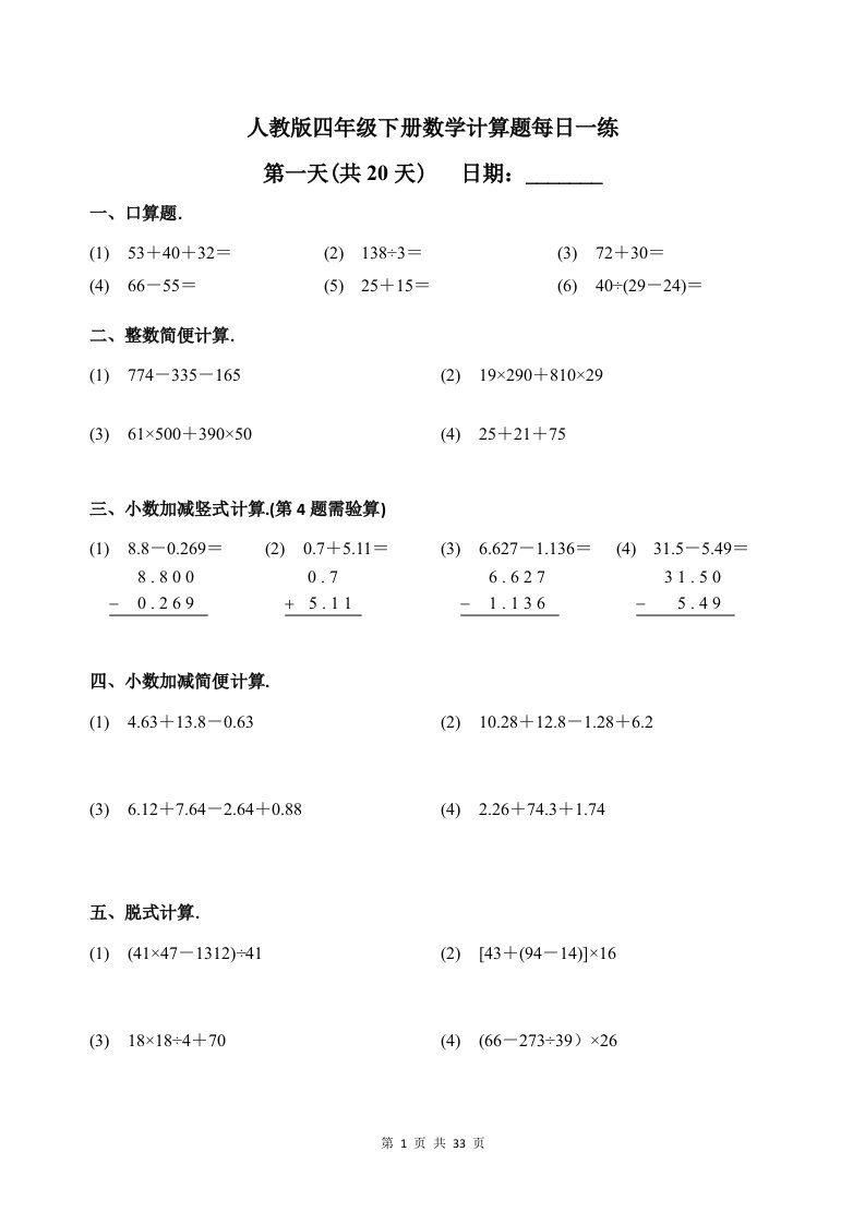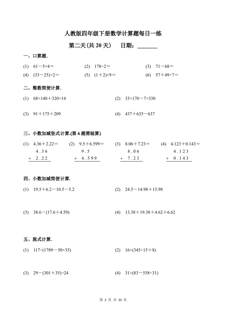当前位置: 首页小学资源小学四年级正文 人教四下数学-计算题每日一练_共38页 小学四年级 7 天前 0 0 15 以上为部分内容预览,如需源文档请登录您的会员账号进行下载! 声明:本站所有文章,如无特殊说明或标注,均为本站原创发布。任何个人或组织,在未征得本站同意时,禁止复制、盗用、采集、发布本站内容到任何网站、书籍等各类媒体平台。如若本站内容侵犯了原著者的合法权益,可联系我们进行处理。 尚学资源永久会员 打赏 收藏 海报 链接