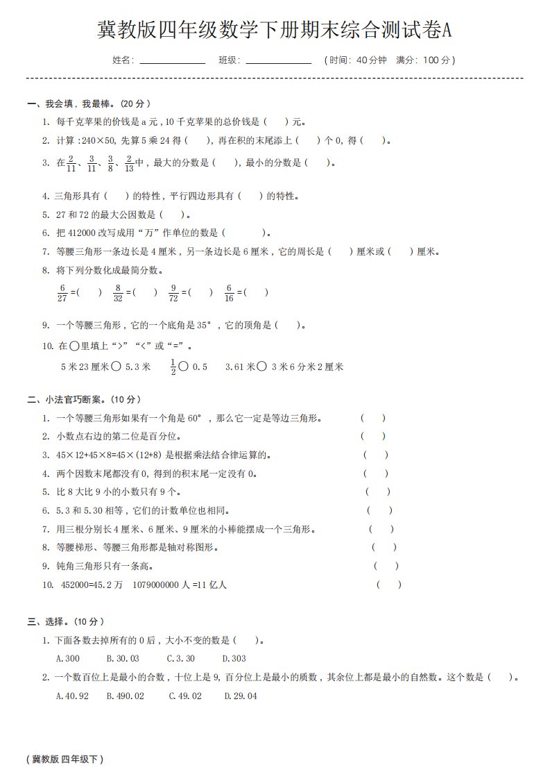 当前位置: 首页小学资源小学四年级正文 【冀教版】四年级数学下册期末综合测试卷a_共5页 小学四年级 7 天前 0 0 5 以上为部分内容预览,如需源文档请登录您的会员账号进行下载! 声明:本站所有文章,如无特殊说明或标注,均为本站原创发布。任何个人或组织,在未征得本站同意时,禁止复制、盗用、采集、发布本站内容到任何网站、书籍等各类媒体平台。如若本站内容侵犯了原著者的合法权益,可联系我们进行处理。 尚学资源永久会员 打赏 收藏 海报 链接