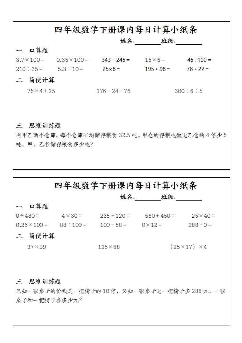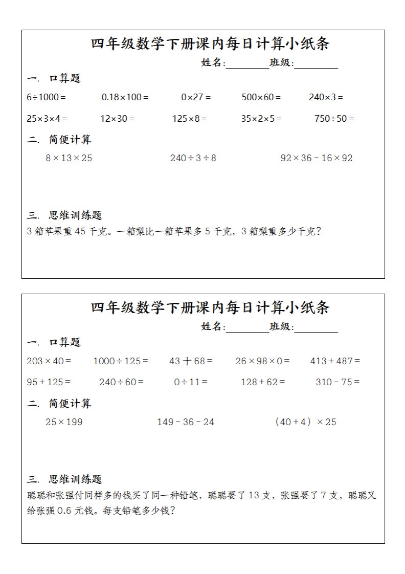 当前位置: 首页小学资源小学四年级正文 四下数学课内每日计算小纸条(10条)_共5页 小学四年级 7 天前 0 0 5 以上为部分内容预览,如需源文档请登录您的会员账号进行下载! 声明:本站所有文章,如无特殊说明或标注,均为本站原创发布。任何个人或组织,在未征得本站同意时,禁止复制、盗用、采集、发布本站内容到任何网站、书籍等各类媒体平台。如若本站内容侵犯了原著者的合法权益,可联系我们进行处理。 尚学资源永久会员 打赏 收藏 海报 链接