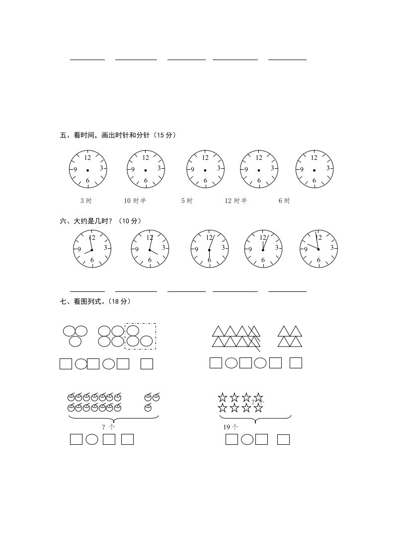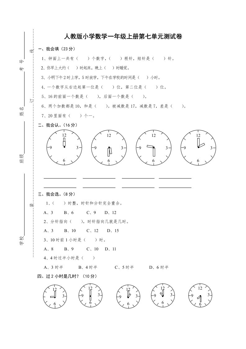 一年级数学上册第七单元《认识钟表》试卷1(人教版)_共2页
