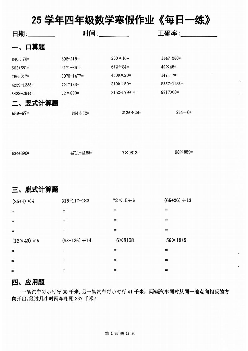 25学年四下【数学寒假作业】每日一练20天(含答案25页)_共25页