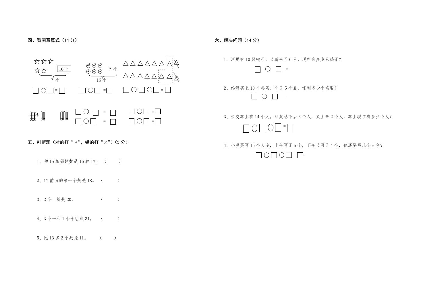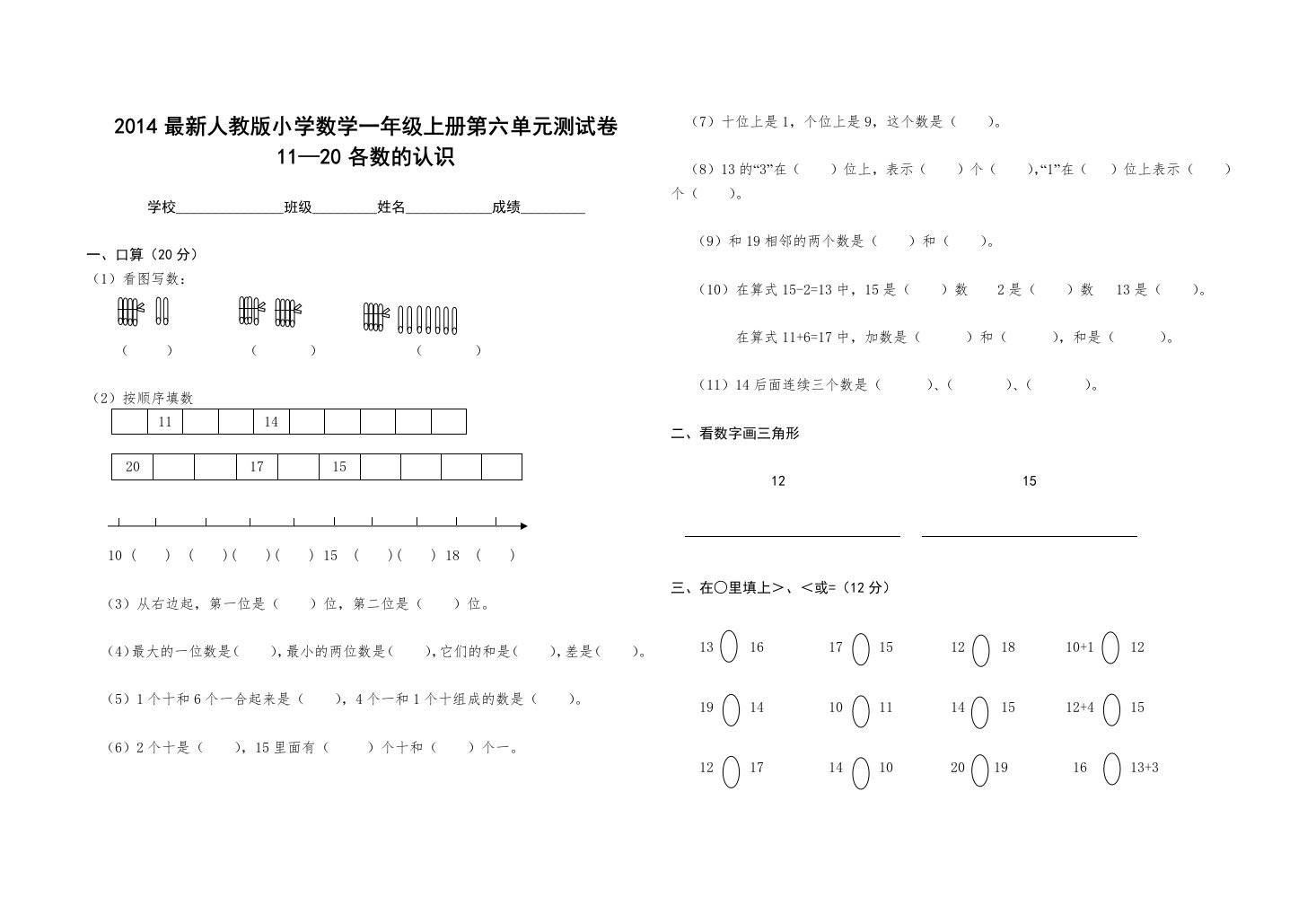 一年级数学上册第六单元测试卷(人教版)_共2页