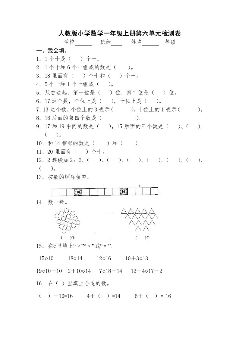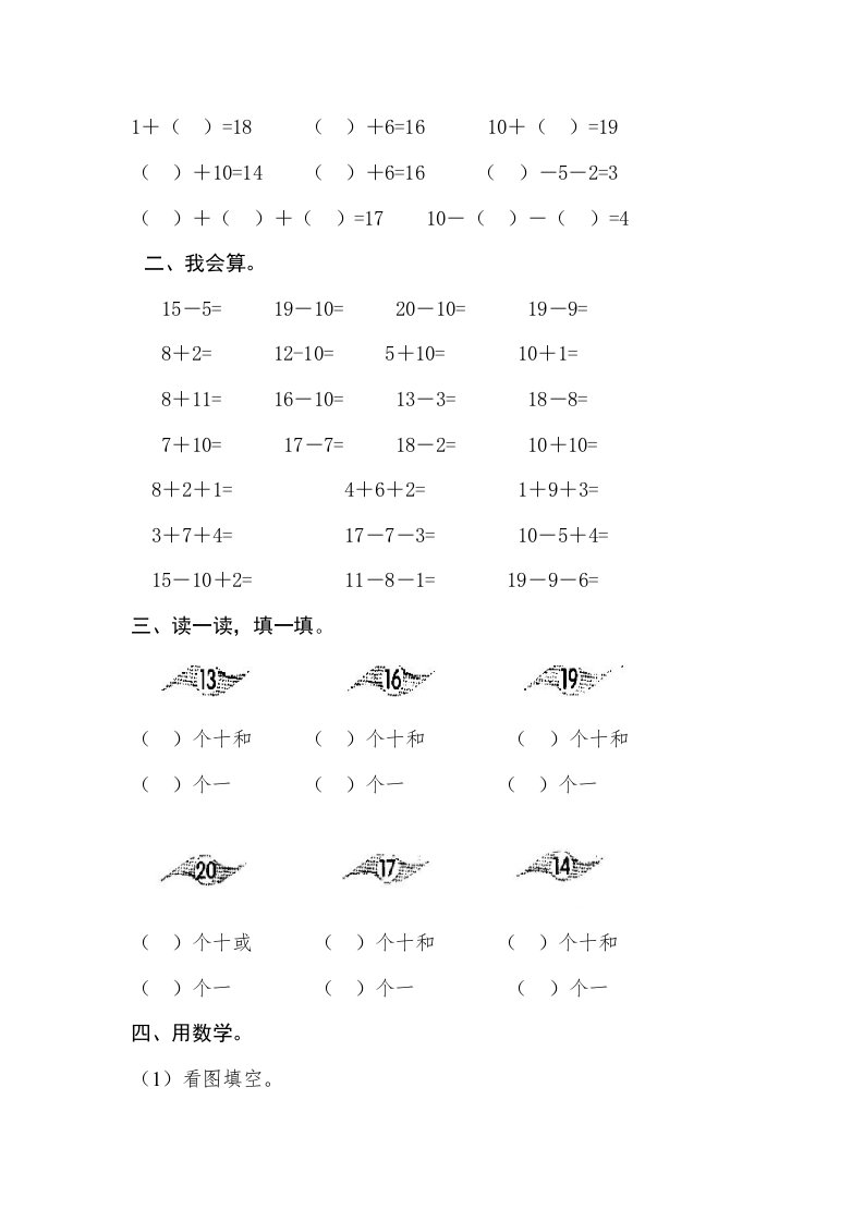 一年级数学上册第六单元《11-20个数的认识》试卷3(人教版)_共4页