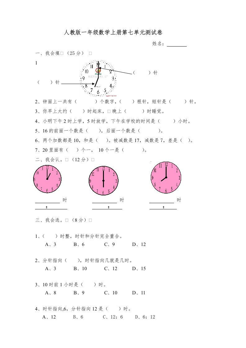一年级数学上册第7单元检测卷(人教版)_共3页