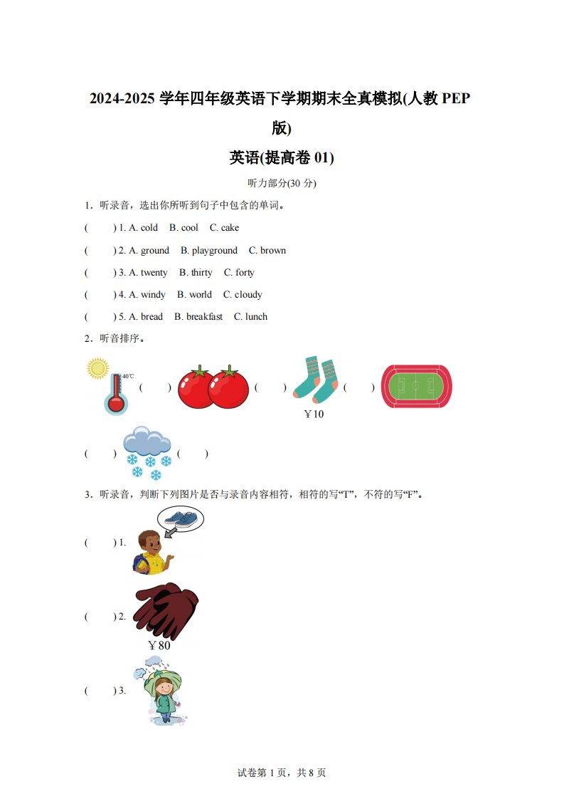 当前位置: 首页小学资源小学四年级正文 2024-2025学年四年级英语下学期期末全真模拟(人教PEP版)英语(提高卷01)_共15页 小学四年级 7 天前 0 0 10 以上为部分内容预览,如需源文档请登录您的会员账号进行下载! 声明:本站所有文章,如无特殊说明或标注,均为本站原创发布。任何个人或组织,在未征得本站同意时,禁止复制、盗用、采集、发布本站内容到任何网站、书籍等各类媒体平台。如若本站内容侵犯了原著者的合法权益,可联系我们进行处理。 尚学资源永久会员 打赏 收藏 海报 链接