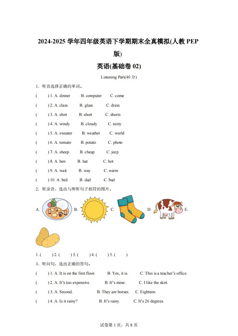 当前位置: 首页小学资源小学四年级正文 2024-2025学年四年级英语下学期期末全真模拟(人教PEP版)英语(基础卷02)_共14页 小学四年级 7 天前 0 0 10 以上为部分内容预览,如需源文档请登录您的会员账号进行下载! 声明:本站所有文章,如无特殊说明或标注,均为本站原创发布。任何个人或组织,在未征得本站同意时,禁止复制、盗用、采集、发布本站内容到任何网站、书籍等各类媒体平台。如若本站内容侵犯了原著者的合法权益,可联系我们进行处理。 尚学资源永久会员 打赏 收藏 海报 链接