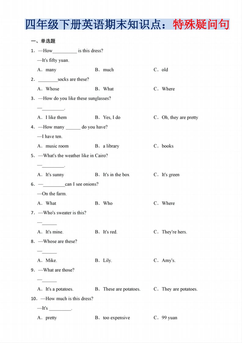 当前位置: 首页小学资源小学四年级正文 四年级下英语期末疑问句知识点训练《人教PEP版》_共4页 小学四年级 6 天前 0 0 5 以上为部分内容预览,如需源文档请登录您的会员账号进行下载! 声明:本站所有文章,如无特殊说明或标注,均为本站原创发布。任何个人或组织,在未征得本站同意时,禁止复制、盗用、采集、发布本站内容到任何网站、书籍等各类媒体平台。如若本站内容侵犯了原著者的合法权益,可联系我们进行处理。 尚学资源永久会员 打赏 收藏 海报 链接