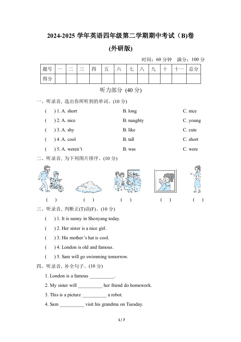 当前位置: 首页小学资源小学四年级正文 外研版2024-2025学年英语四年级下册第二学期期中考试(B)卷_共9页 小学四年级 6 天前 0 0 5 以上为部分内容预览,如需源文档请登录您的会员账号进行下载! 声明:本站所有文章,如无特殊说明或标注,均为本站原创发布。任何个人或组织,在未征得本站同意时,禁止复制、盗用、采集、发布本站内容到任何网站、书籍等各类媒体平台。如若本站内容侵犯了原著者的合法权益,可联系我们进行处理。 尚学资源永久会员 打赏 收藏 海报 链接