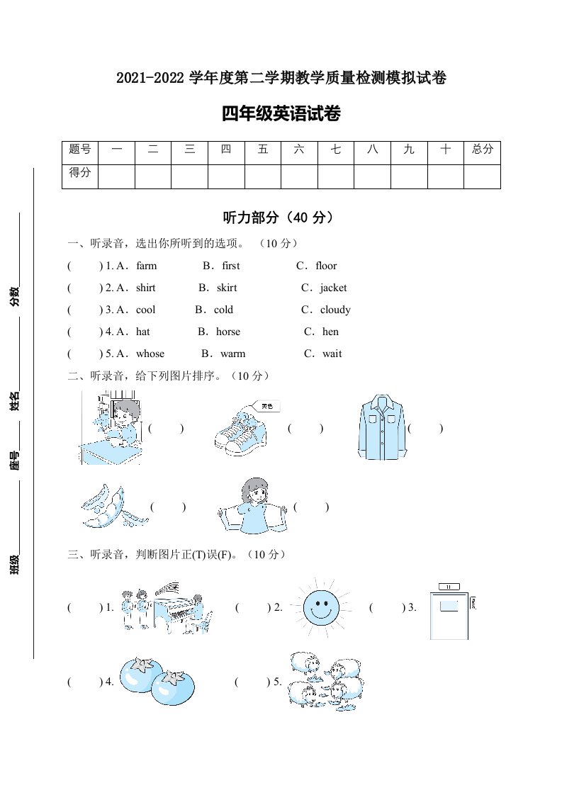 当前位置: 首页小学资源小学四年级正文 四年级英语下册【标准化测试】期末测试A卷(人教PEP版含听力音频+答案)_共7页 小学四年级 6 天前 0 0 5 以上为部分内容预览,如需源文档请登录您的会员账号进行下载! 声明:本站所有文章,如无特殊说明或标注,均为本站原创发布。任何个人或组织,在未征得本站同意时,禁止复制、盗用、采集、发布本站内容到任何网站、书籍等各类媒体平台。如若本站内容侵犯了原著者的合法权益,可联系我们进行处理。 尚学资源永久会员 打赏 收藏 海报 链接