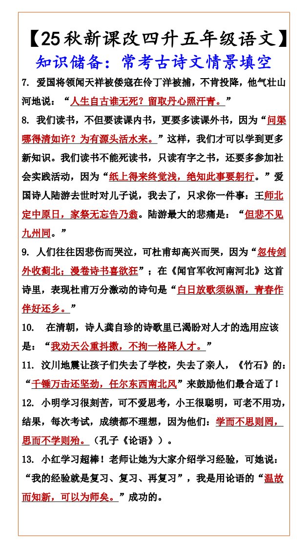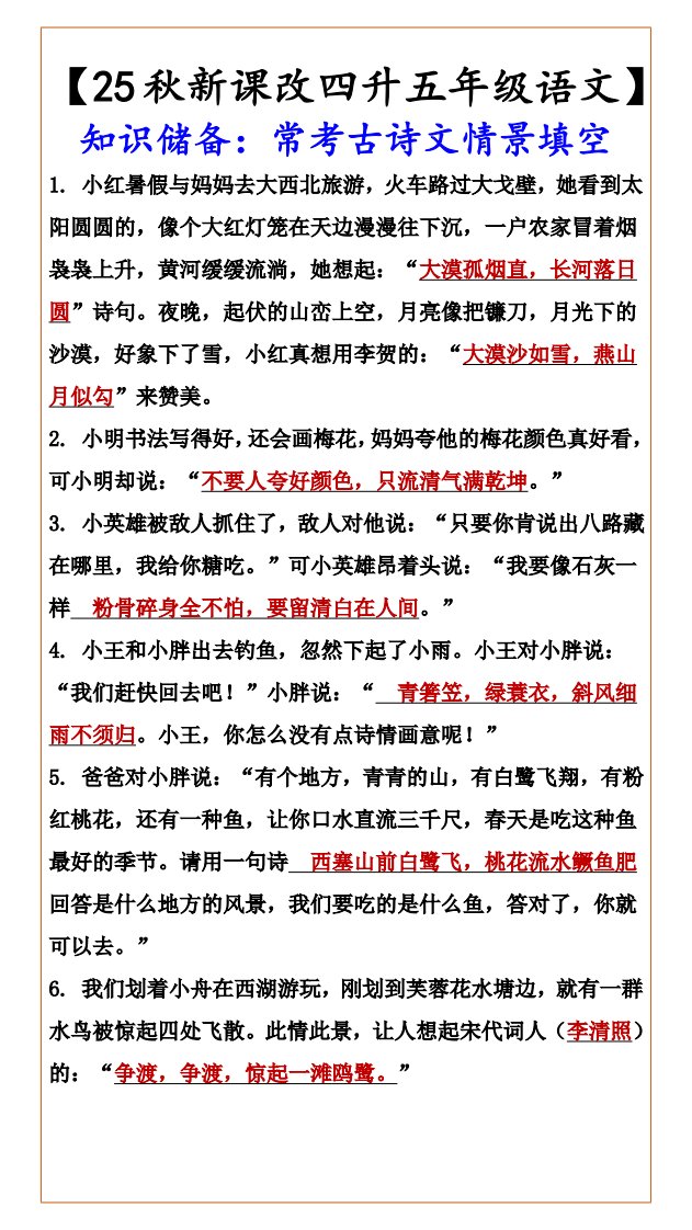 当前位置: 首页小学资源小学五年级正文 【2025秋新版】【四升五年级语文】知识储备:常考古诗文情景填空-五上语文_共4页 小学五年级 1 周前 0 0 5 以上为部分内容预览,如需源文档请登录您的会员账号进行下载! 声明:本站所有文章,如无特殊说明或标注,均为本站原创发布。任何个人或组织,在未征得本站同意时,禁止复制、盗用、采集、发布本站内容到任何网站、书籍等各类媒体平台。如若本站内容侵犯了原著者的合法权益,可联系我们进行处理。 尚学资源永久会员 打赏 收藏 海报 链接