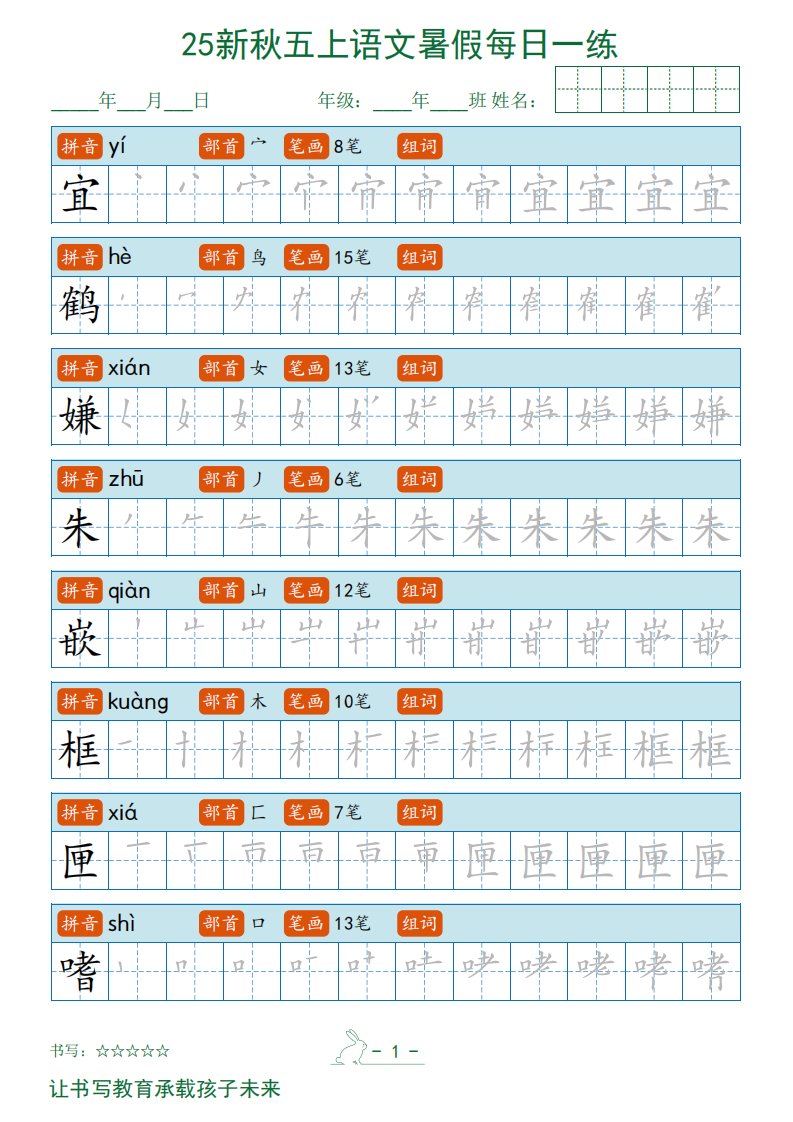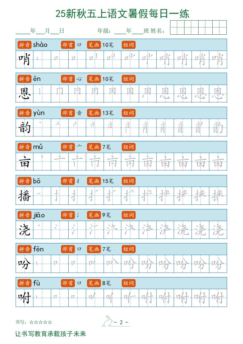 当前位置: 首页小学资源小学五年级正文 2025秋新五上语文暑假每日一练字帖_共28页 小学五年级 7 天前 0 0 15 以上为部分内容预览,如需源文档请登录您的会员账号进行下载! 声明:本站所有文章,如无特殊说明或标注,均为本站原创发布。任何个人或组织,在未征得本站同意时,禁止复制、盗用、采集、发布本站内容到任何网站、书籍等各类媒体平台。如若本站内容侵犯了原著者的合法权益,可联系我们进行处理。 尚学资源永久会员 打赏 收藏 海报 链接