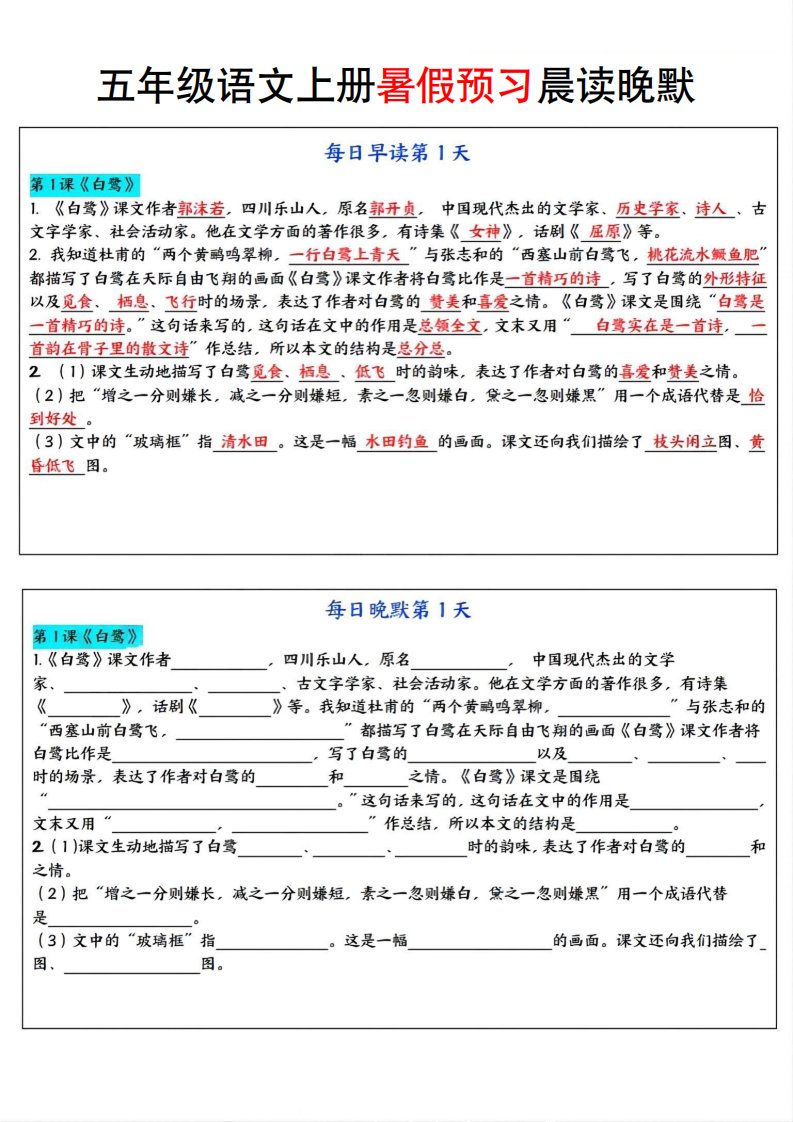当前位置: 首页小学资源小学五年级正文 五年级语文上册暑假预习晨读晚默_共24页 小学五年级 6 天前 0 0 15 以上为部分内容预览,如需源文档请登录您的会员账号进行下载! 声明:本站所有文章,如无特殊说明或标注,均为本站原创发布。任何个人或组织,在未征得本站同意时,禁止复制、盗用、采集、发布本站内容到任何网站、书籍等各类媒体平台。如若本站内容侵犯了原著者的合法权益,可联系我们进行处理。 尚学资源永久会员 打赏 收藏 海报 链接