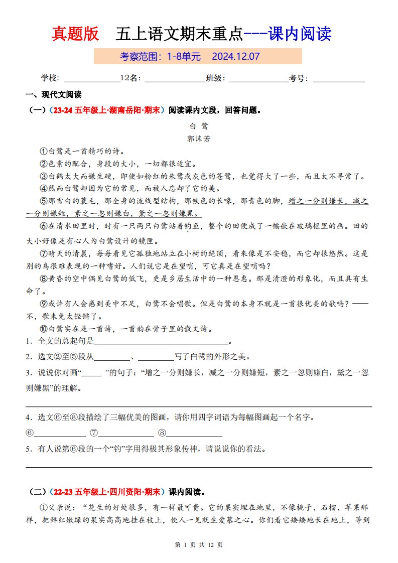 当前位置: 首页小学资源小学五年级正文 【期末复习课内阅读真题版】五上语文_共12页 小学五年级 1 周前 0 0 10 以上为部分内容预览,如需源文档请登录您的会员账号进行下载! 声明:本站所有文章,如无特殊说明或标注,均为本站原创发布。任何个人或组织,在未征得本站同意时,禁止复制、盗用、采集、发布本站内容到任何网站、书籍等各类媒体平台。如若本站内容侵犯了原著者的合法权益,可联系我们进行处理。 尚学资源永久会员 打赏 收藏 海报 链接