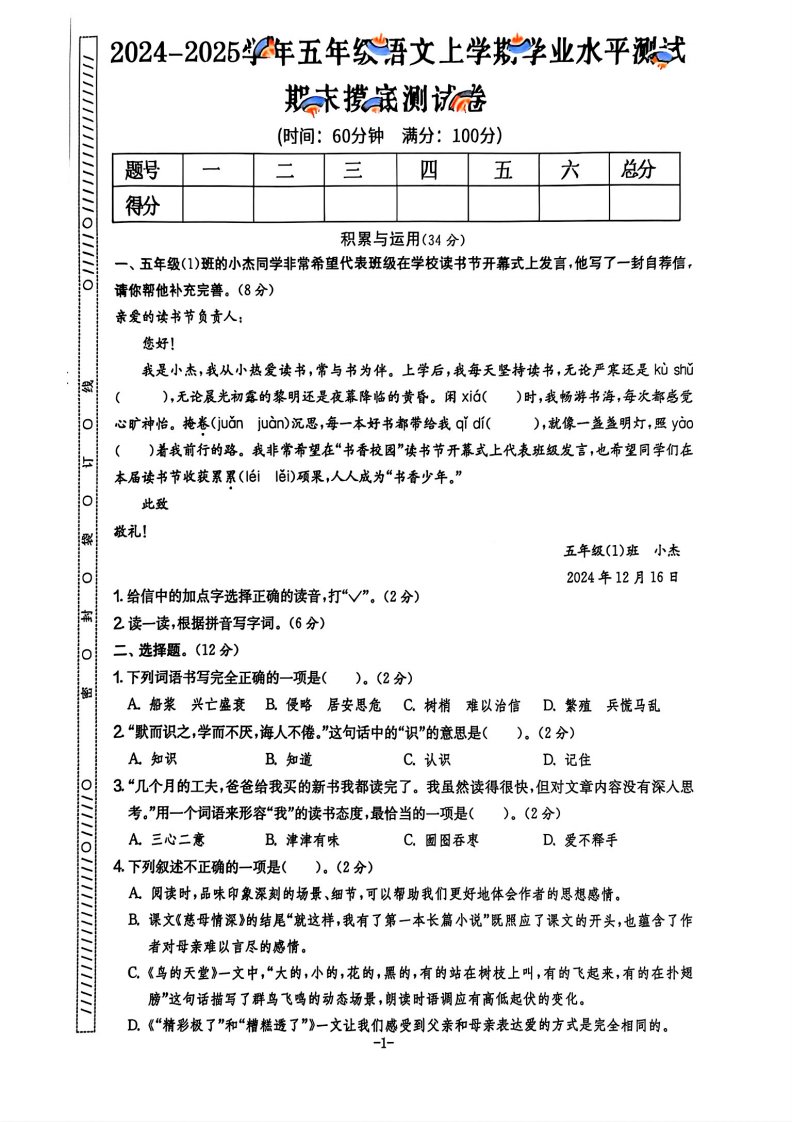 当前位置: 首页小学资源小学五年级正文 2024秋五上语文期末试卷_共26页 小学五年级 7 天前 0 0 15 以上为部分内容预览,如需源文档请登录您的会员账号进行下载! 声明:本站所有文章,如无特殊说明或标注,均为本站原创发布。任何个人或组织,在未征得本站同意时,禁止复制、盗用、采集、发布本站内容到任何网站、书籍等各类媒体平台。如若本站内容侵犯了原著者的合法权益,可联系我们进行处理。 尚学资源永久会员 打赏 收藏 海报 链接