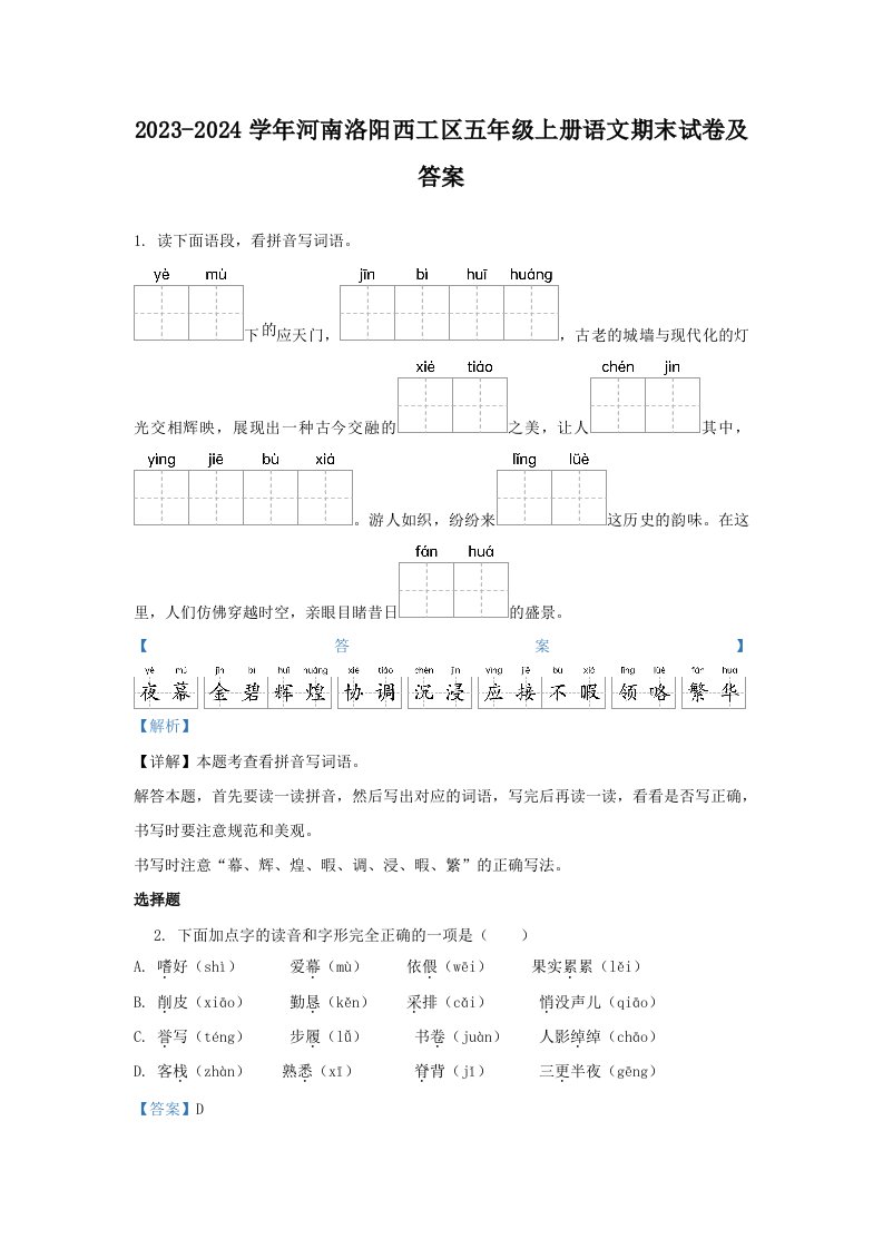 当前位置: 首页小学资源小学五年级正文 2023-2024学年河南洛阳西工区五年级上册语文期末试卷及答案(Word版)_共15页 小学五年级 7 天前 0 0 10 以上为部分内容预览,如需源文档请登录您的会员账号进行下载! 声明:本站所有文章,如无特殊说明或标注,均为本站原创发布。任何个人或组织,在未征得本站同意时,禁止复制、盗用、采集、发布本站内容到任何网站、书籍等各类媒体平台。如若本站内容侵犯了原著者的合法权益,可联系我们进行处理。 尚学资源永久会员 打赏 收藏 海报 链接