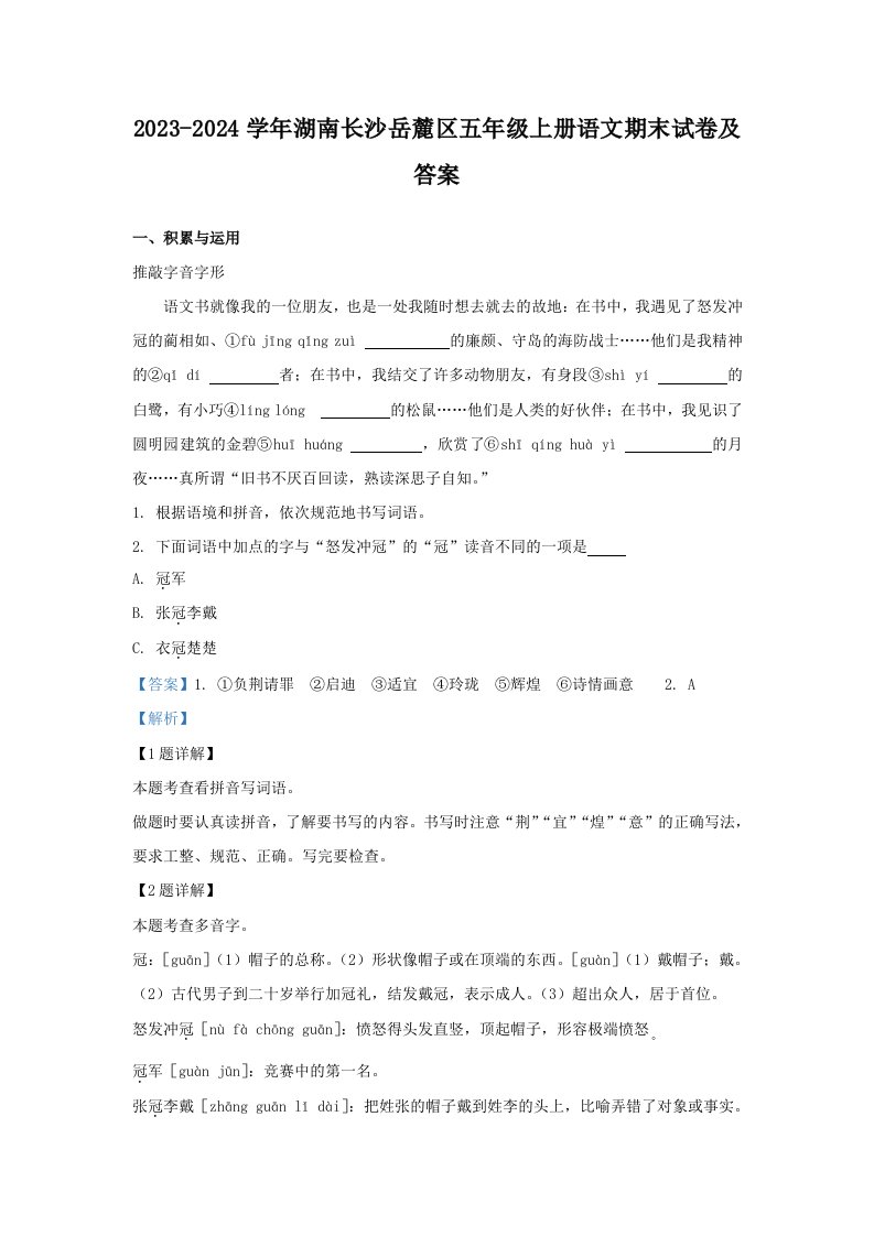 当前位置: 首页小学资源小学五年级正文 2023-2024学年湖南长沙岳麓区五年级上册语文期末试卷及答案(Word版)_共16页 小学五年级 7 天前 0 0 10 以上为部分内容预览,如需源文档请登录您的会员账号进行下载! 声明:本站所有文章,如无特殊说明或标注,均为本站原创发布。任何个人或组织,在未征得本站同意时,禁止复制、盗用、采集、发布本站内容到任何网站、书籍等各类媒体平台。如若本站内容侵犯了原著者的合法权益,可联系我们进行处理。 尚学资源永久会员 打赏 收藏 海报 链接