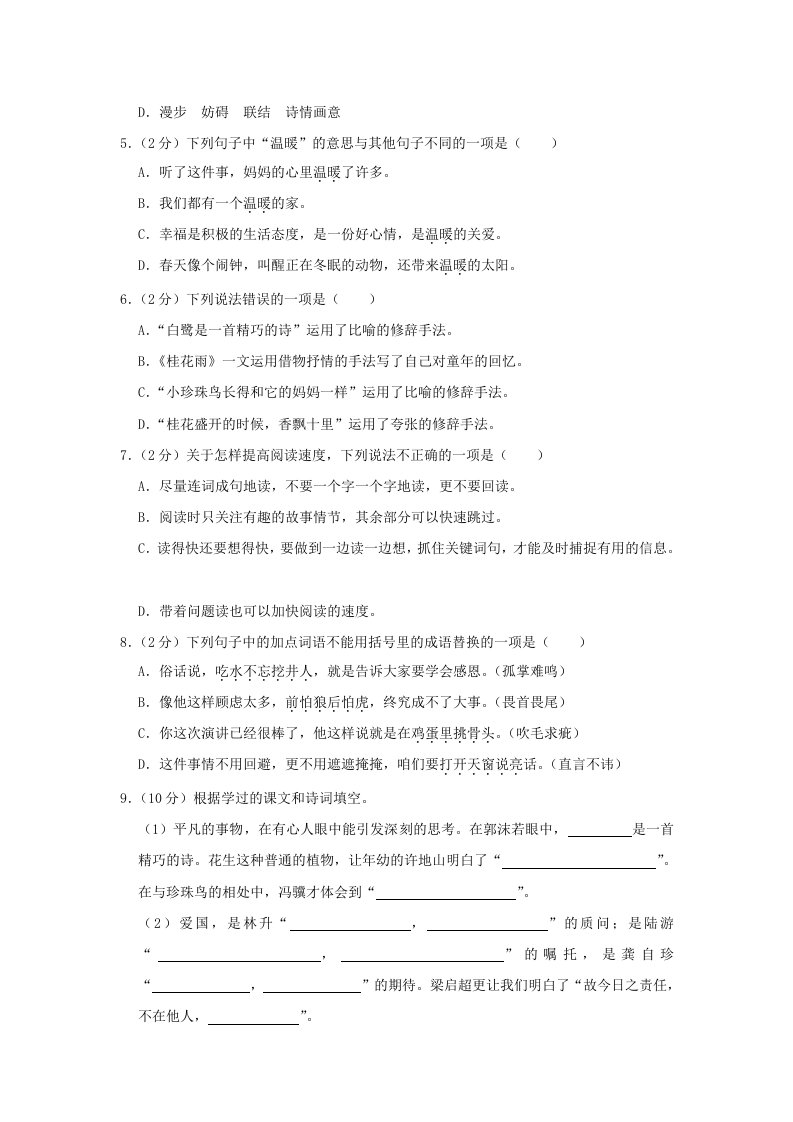当前位置: 首页小学资源小学五年级正文 2023-2024学年浙江温州瑞安市五年级上册语文期中试卷及答案(Word版)_共19页 小学五年级 7 天前 0 0 10 以上为部分内容预览,如需源文档请登录您的会员账号进行下载! 声明:本站所有文章,如无特殊说明或标注,均为本站原创发布。任何个人或组织,在未征得本站同意时,禁止复制、盗用、采集、发布本站内容到任何网站、书籍等各类媒体平台。如若本站内容侵犯了原著者的合法权益,可联系我们进行处理。 尚学资源永久会员 打赏 收藏 海报 链接
