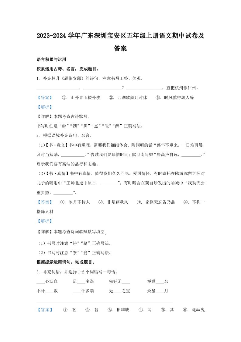 2023-2024学年广东深圳宝安区五年级上册语文期中试卷及答案(Word版)_共12页