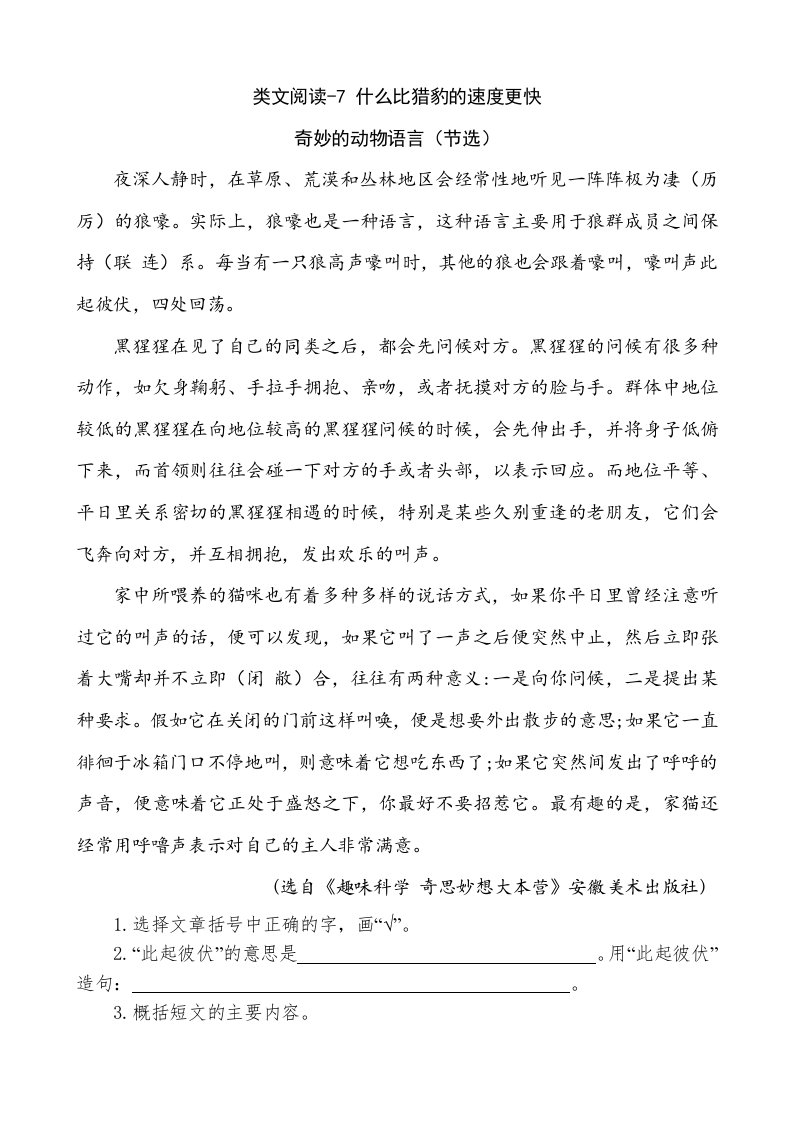 当前位置: 首页小学资源小学五年级正文 五年级语文上册类文阅读-7什么比猎豹的速度更快(部编版)_共4页 小学五年级 7 天前 0 0 5 以上为部分内容预览,如需源文档请登录您的会员账号进行下载! 声明:本站所有文章,如无特殊说明或标注,均为本站原创发布。任何个人或组织,在未征得本站同意时,禁止复制、盗用、采集、发布本站内容到任何网站、书籍等各类媒体平台。如若本站内容侵犯了原著者的合法权益,可联系我们进行处理。 尚学资源永久会员 打赏 收藏 海报 链接