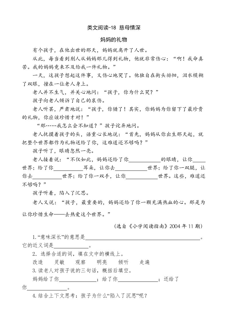 当前位置: 首页小学资源小学五年级正文 五年级语文上册类文阅读-18慈母情深(部编版)_共4页 小学五年级 1 周前 0 0 5 以上为部分内容预览,如需源文档请登录您的会员账号进行下载! 声明:本站所有文章,如无特殊说明或标注,均为本站原创发布。任何个人或组织,在未征得本站同意时,禁止复制、盗用、采集、发布本站内容到任何网站、书籍等各类媒体平台。如若本站内容侵犯了原著者的合法权益,可联系我们进行处理。 尚学资源永久会员 打赏 收藏 海报 链接