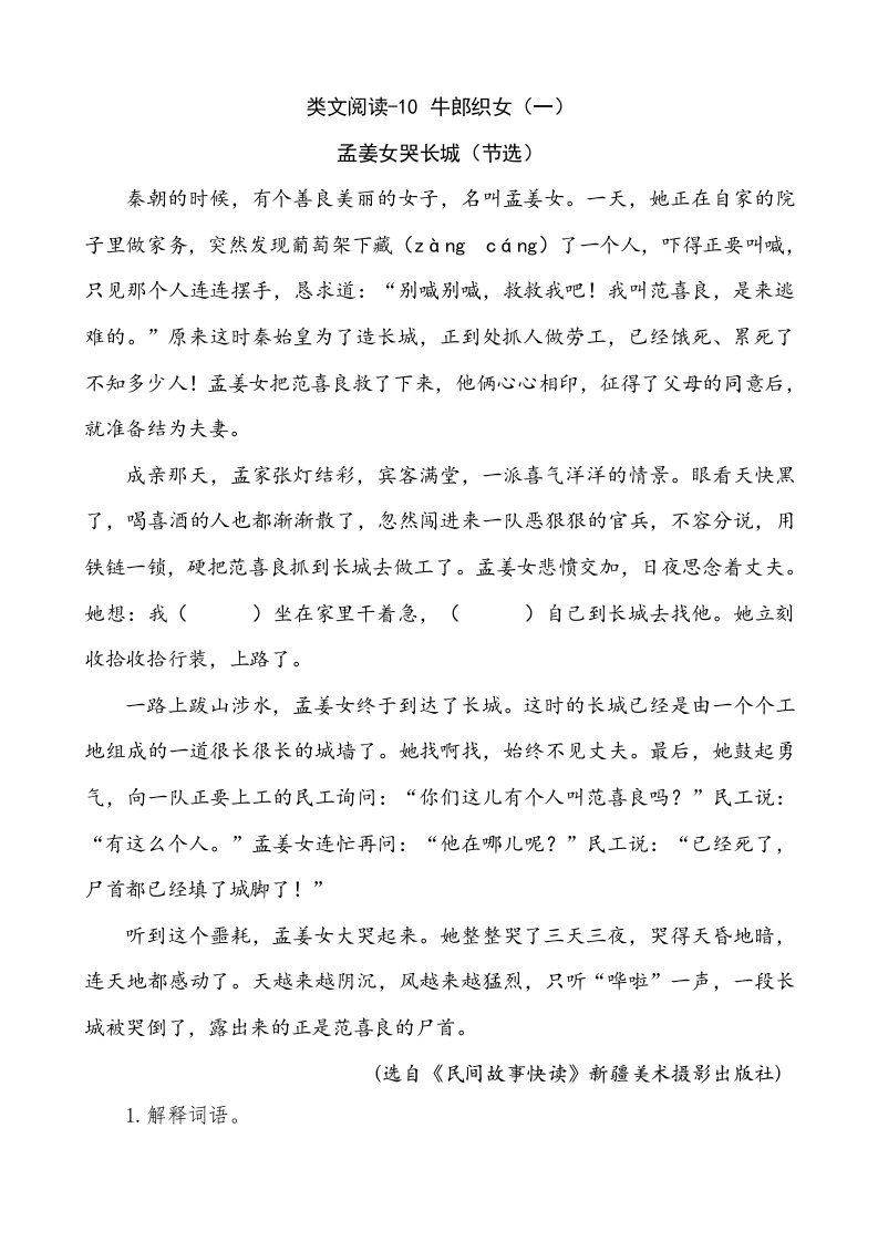当前位置: 首页小学资源小学五年级正文 五年级语文上册类文阅读-10牛郎织女(一)(部编版)_共4页 小学五年级 7 天前 0 0 5 以上为部分内容预览,如需源文档请登录您的会员账号进行下载! 声明:本站所有文章,如无特殊说明或标注,均为本站原创发布。任何个人或组织,在未征得本站同意时,禁止复制、盗用、采集、发布本站内容到任何网站、书籍等各类媒体平台。如若本站内容侵犯了原著者的合法权益,可联系我们进行处理。 尚学资源永久会员 打赏 收藏 海报 链接