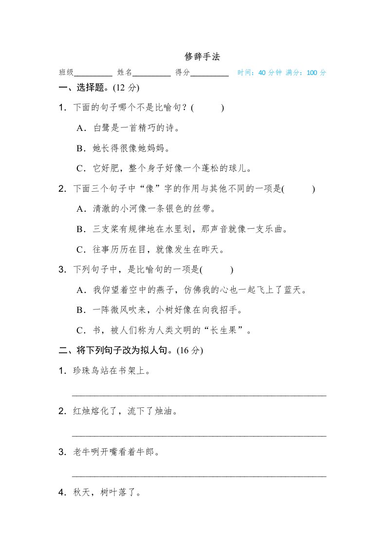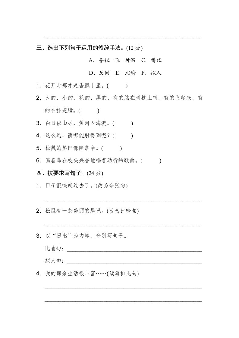 当前位置: 首页小学资源小学五年级正文 五年级语文上册修辞手法(部编版)_共5页 小学五年级 7 天前 0 0 5 以上为部分内容预览,如需源文档请登录您的会员账号进行下载! 声明:本站所有文章,如无特殊说明或标注,均为本站原创发布。任何个人或组织,在未征得本站同意时,禁止复制、盗用、采集、发布本站内容到任何网站、书籍等各类媒体平台。如若本站内容侵犯了原著者的合法权益,可联系我们进行处理。 尚学资源永久会员 打赏 收藏 海报 链接