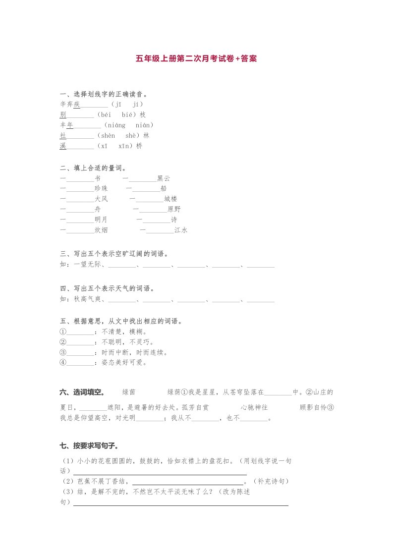 五年级语文上册第二次月考试卷部编版(附答案)(部编版)_共6页
