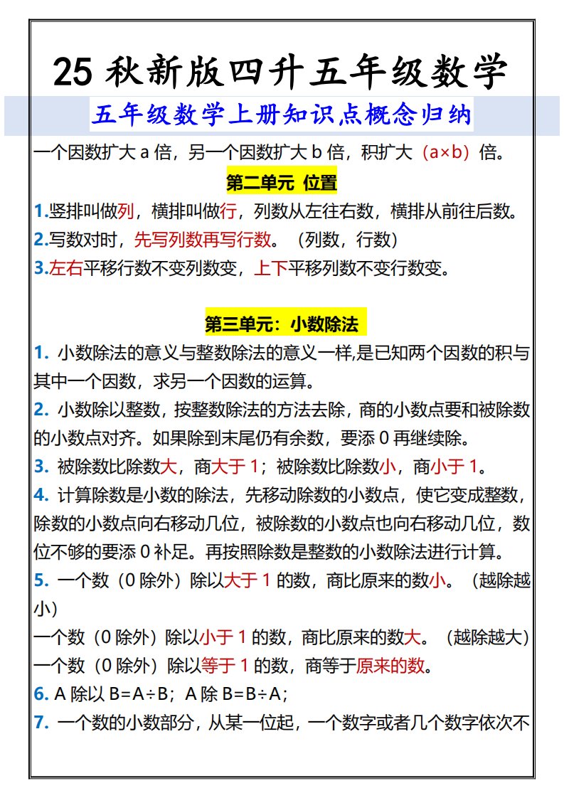 当前位置: 首页小学资源小学五年级正文 【2025秋新版】五年级数学上册知识点概念归纳_共7页 小学五年级 6 天前 0 0 5 以上为部分内容预览,如需源文档请登录您的会员账号进行下载! 声明:本站所有文章,如无特殊说明或标注,均为本站原创发布。任何个人或组织,在未征得本站同意时,禁止复制、盗用、采集、发布本站内容到任何网站、书籍等各类媒体平台。如若本站内容侵犯了原著者的合法权益,可联系我们进行处理。 尚学资源永久会员 打赏 收藏 海报 链接