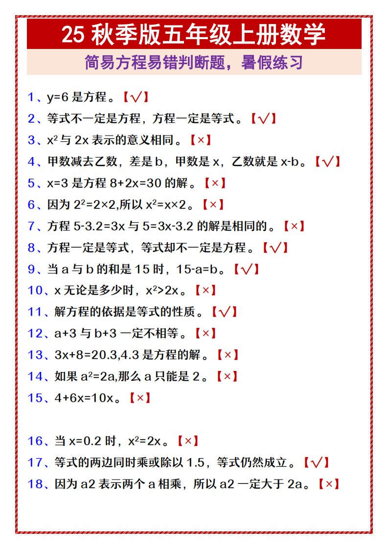 【2025秋新版】五年级上册数学简易方程易错判断题,暑假练习_共1页
