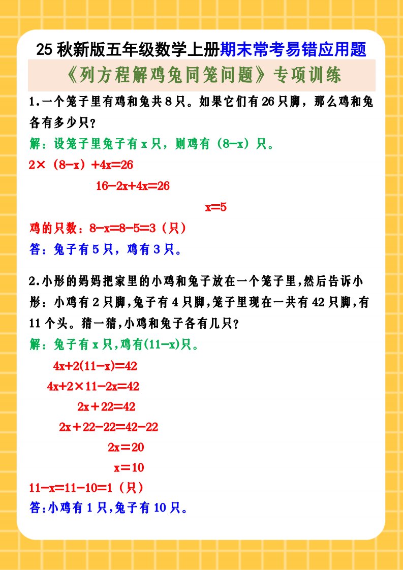 当前位置: 首页小学资源小学五年级正文 【2025秋新版】五年级数学上册期末常考易错应用题《列方程解鸡兔同笼问题》专项训练_共6页 小学五年级 6 天前 0 0 5 以上为部分内容预览,如需源文档请登录您的会员账号进行下载! 声明:本站所有文章,如无特殊说明或标注,均为本站原创发布。任何个人或组织,在未征得本站同意时,禁止复制、盗用、采集、发布本站内容到任何网站、书籍等各类媒体平台。如若本站内容侵犯了原著者的合法权益,可联系我们进行处理。 尚学资源永久会员 打赏 收藏 海报 链接
