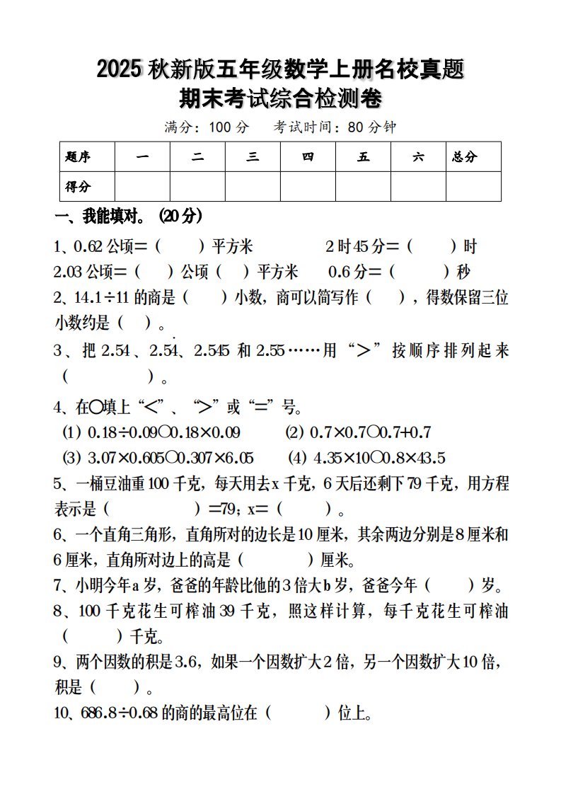 当前位置: 首页小学资源小学五年级正文 【2025秋新版】五年级数学上册名校真题期末考试综合检测卷_共6页 小学五年级 6 天前 0 0 5 以上为部分内容预览,如需源文档请登录您的会员账号进行下载! 声明:本站所有文章,如无特殊说明或标注,均为本站原创发布。任何个人或组织,在未征得本站同意时,禁止复制、盗用、采集、发布本站内容到任何网站、书籍等各类媒体平台。如若本站内容侵犯了原著者的合法权益,可联系我们进行处理。 尚学资源永久会员 打赏 收藏 海报 链接