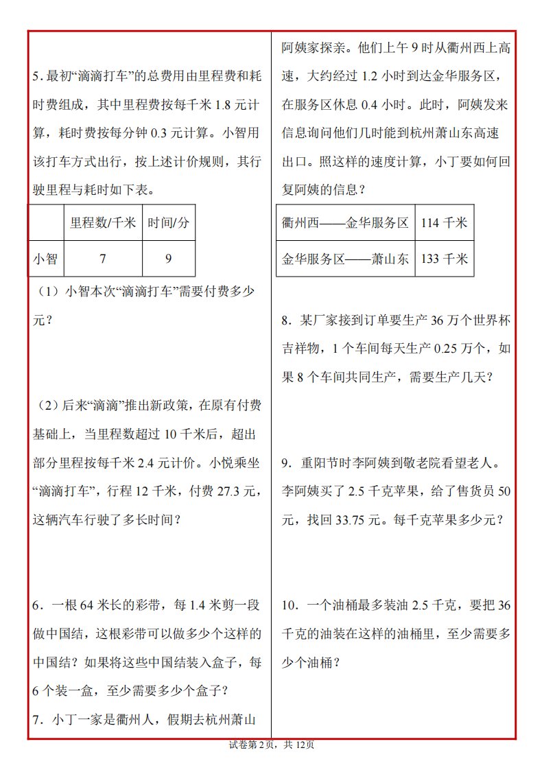 五上北师版数学【期末必考应用题母题50道】_共40页