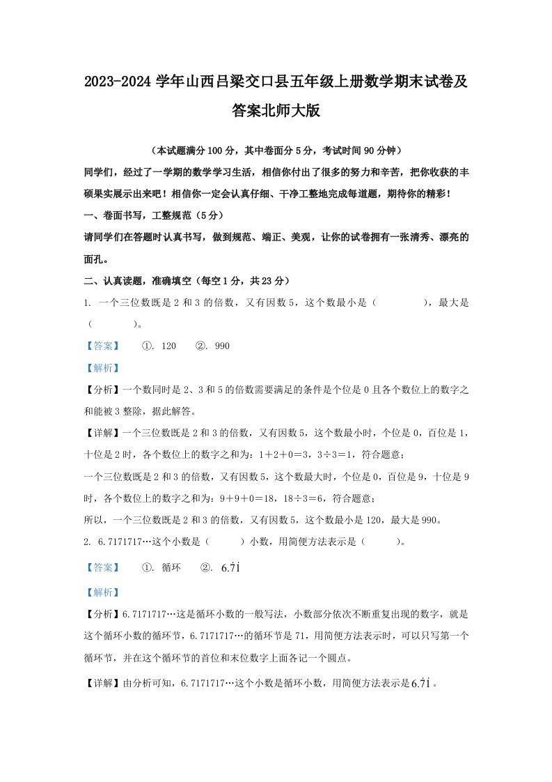 2023-2024学年山西吕梁交口县五年级上册数学期末试卷及答案北师大版(Word版)_共16页