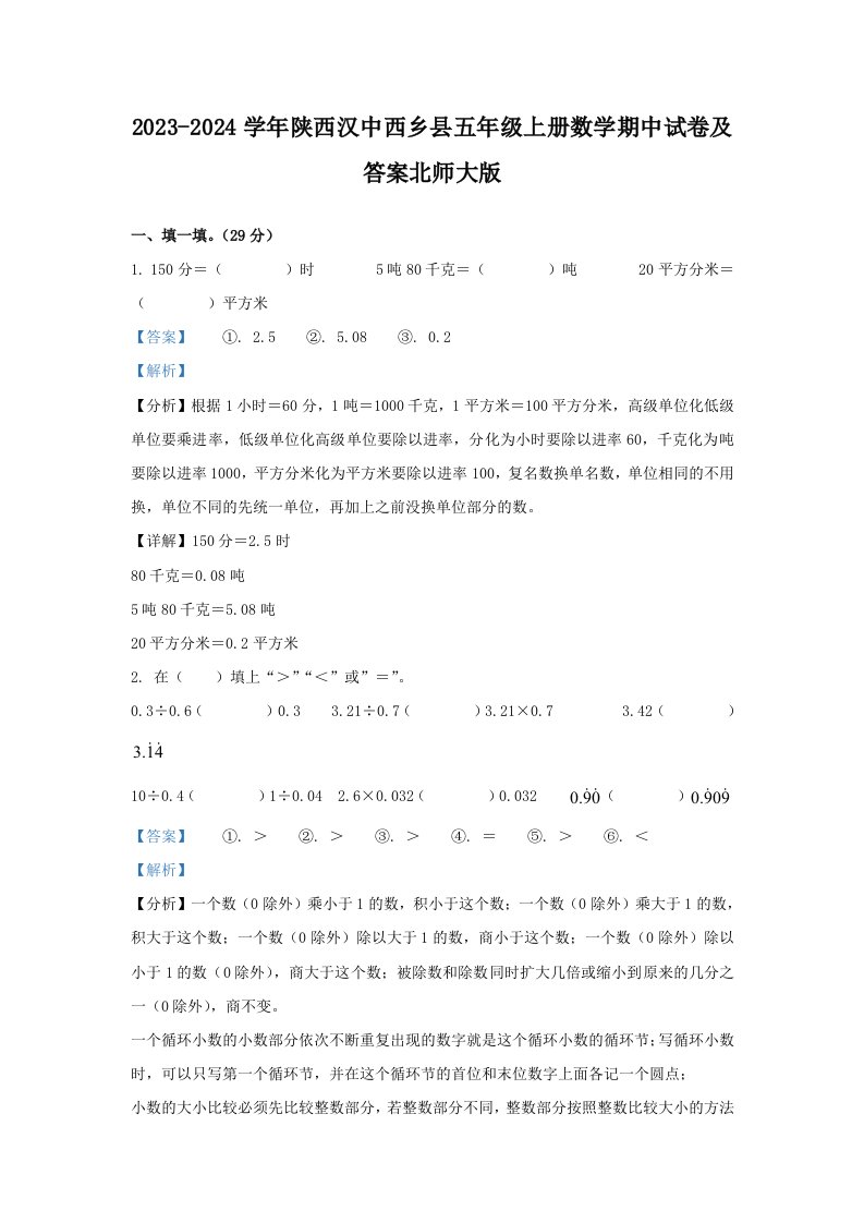 2023-2024学年陕西汉中西乡县五年级上册数学期中试卷及答案北师大版(Word版)_共15页