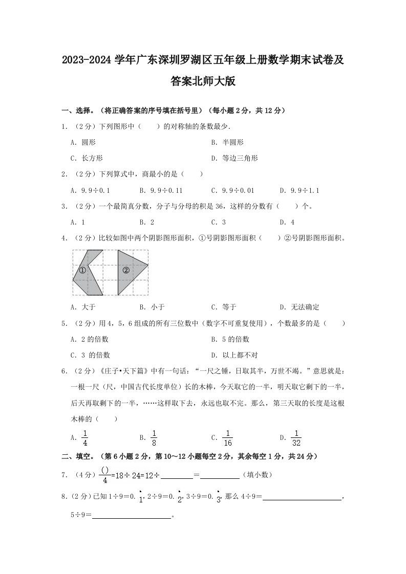 当前位置: 首页小学资源小学五年级正文 2023-2024学年广东深圳罗湖区五年级上册数学期末试卷及答案北师大版(Word版)_共17页 小学五年级 6 天前 0 0 10 以上为部分内容预览,如需源文档请登录您的会员账号进行下载! 声明:本站所有文章,如无特殊说明或标注,均为本站原创发布。任何个人或组织,在未征得本站同意时,禁止复制、盗用、采集、发布本站内容到任何网站、书籍等各类媒体平台。如若本站内容侵犯了原著者的合法权益,可联系我们进行处理。 尚学资源永久会员 打赏 收藏 海报 链接