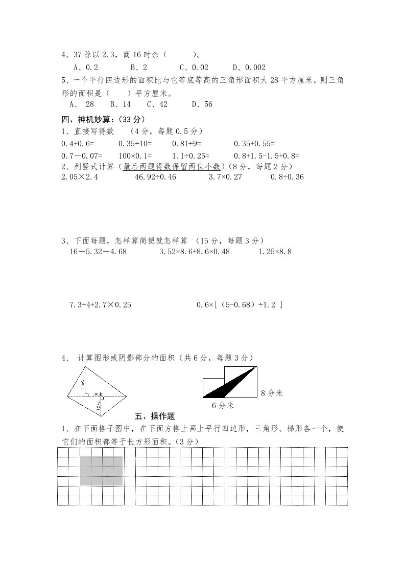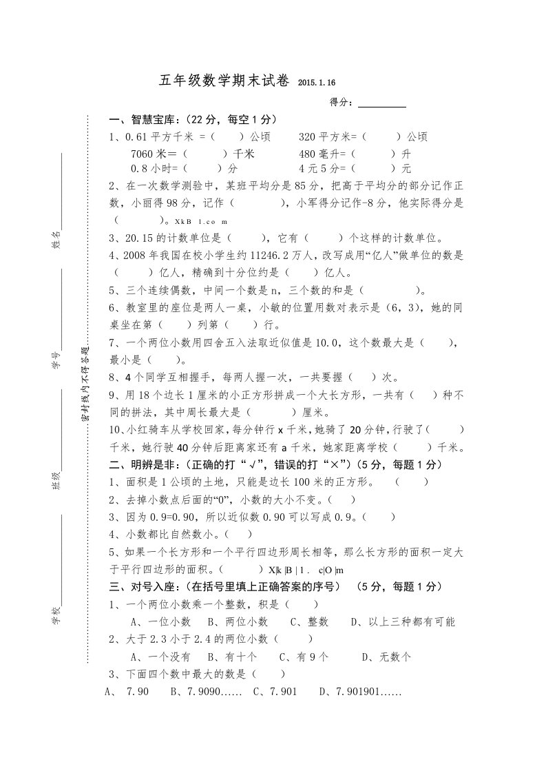 五年级数学上册数学2015年期末测试题(苏教版)_共5页