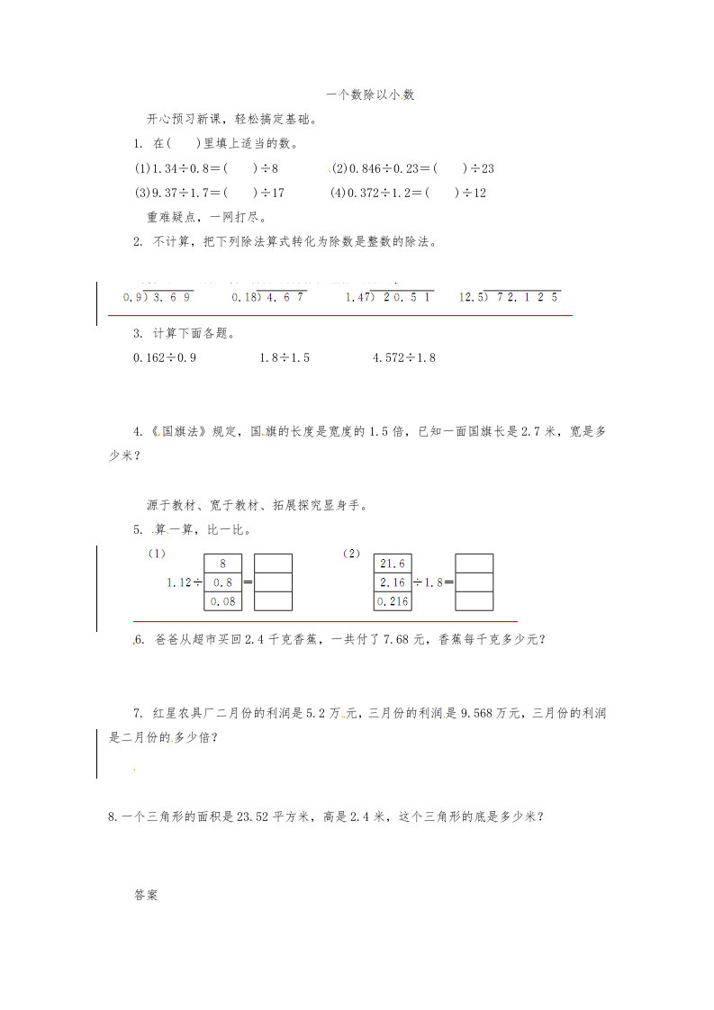 五年级数学上册同步练习题一个数除以小数苏教版(苏教版)_共2页