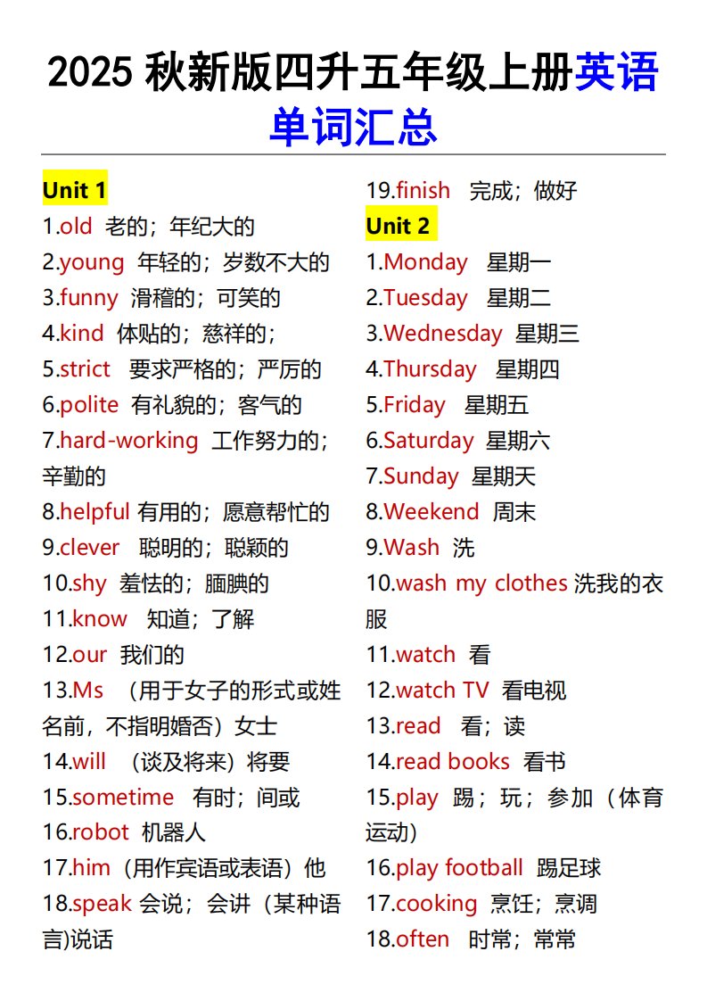 当前位置: 首页小学资源小学五年级正文 【2025秋新版】四升五年级上册英语单词汇总_共4页 小学五年级 6 天前 0 0 5 以上为部分内容预览,如需源文档请登录您的会员账号进行下载! 声明:本站所有文章,如无特殊说明或标注,均为本站原创发布。任何个人或组织,在未征得本站同意时,禁止复制、盗用、采集、发布本站内容到任何网站、书籍等各类媒体平台。如若本站内容侵犯了原著者的合法权益,可联系我们进行处理。 尚学资源永久会员 打赏 收藏 海报 链接