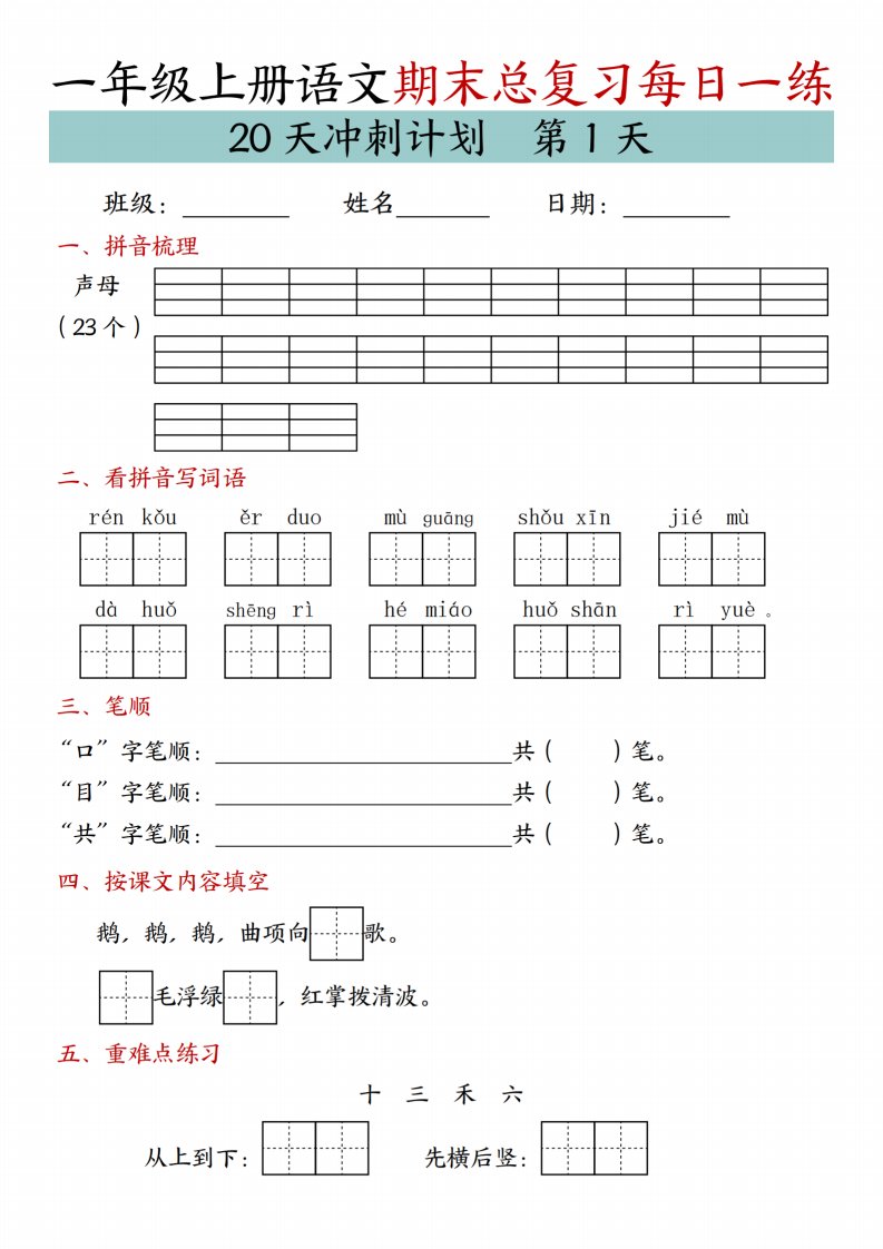 24年一上语文期末总复习冲刺计划20天专项练习_共20页