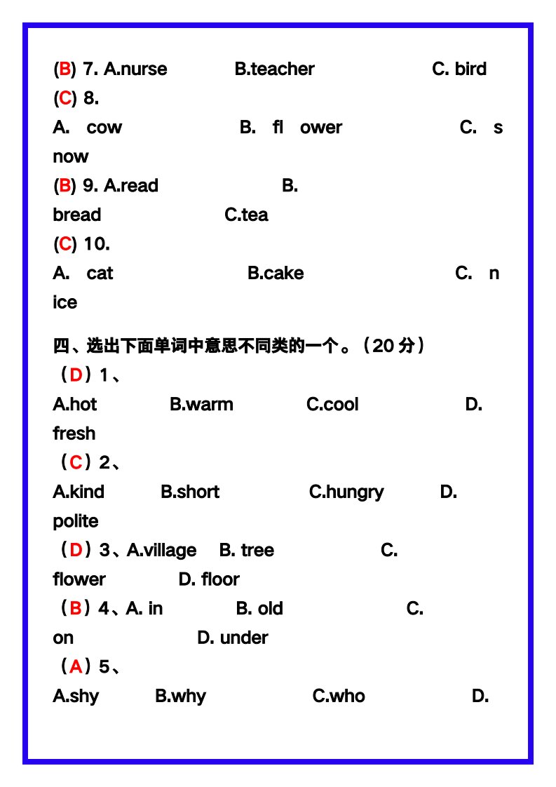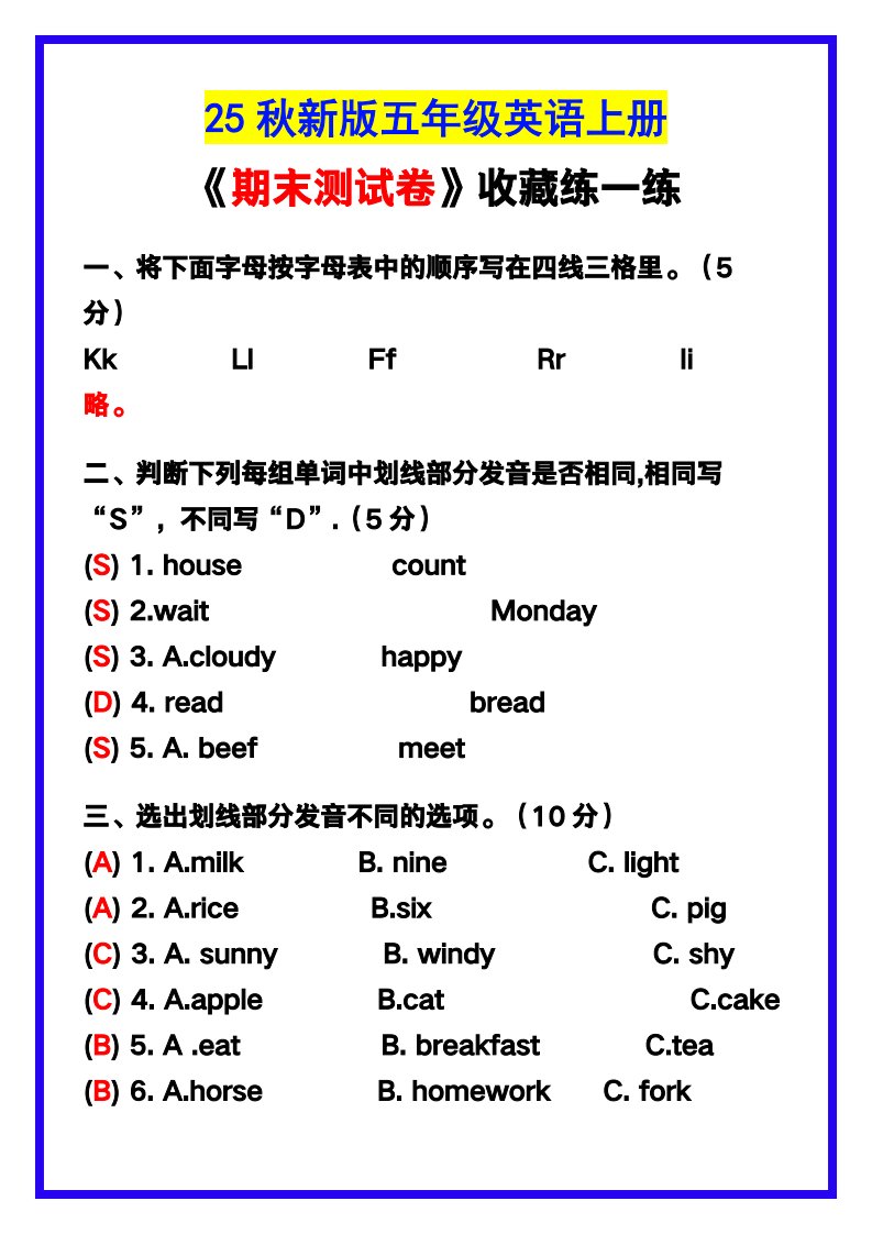 当前位置: 首页小学资源小学五年级正文 【2025秋新版】五年级英语上册《期末测试卷》,收藏练一练!_共8页 小学五年级 6 天前 0 0 5 以上为部分内容预览,如需源文档请登录您的会员账号进行下载! 声明:本站所有文章,如无特殊说明或标注,均为本站原创发布。任何个人或组织,在未征得本站同意时,禁止复制、盗用、采集、发布本站内容到任何网站、书籍等各类媒体平台。如若本站内容侵犯了原著者的合法权益,可联系我们进行处理。 尚学资源永久会员 打赏 收藏 海报 链接