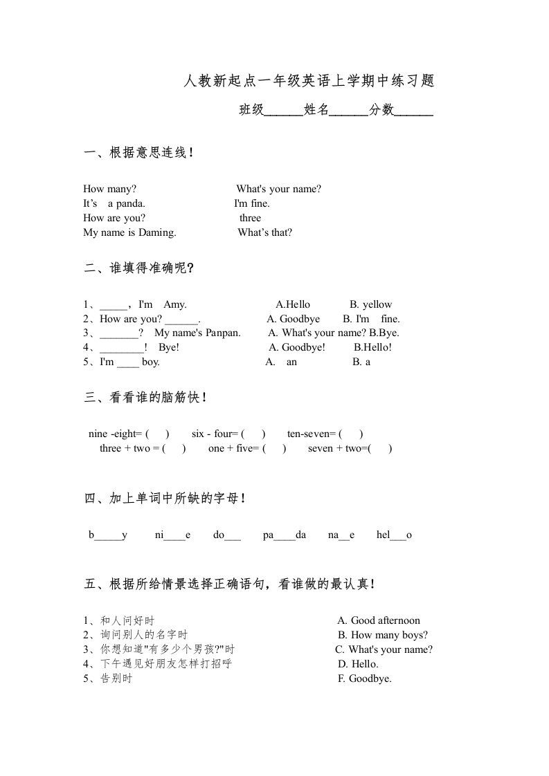 当前位置: 首页小学资源小学一年级正文 一年级英语上册期中测试卷(5)(人教一起点)_共2页 小学一年级 2 周前 0 0 5 以上为部分内容预览,如需源文档请登录您的会员账号进行下载! 声明:本站所有文章,如无特殊说明或标注,均为本站原创发布。任何个人或组织,在未征得本站同意时,禁止复制、盗用、采集、发布本站内容到任何网站、书籍等各类媒体平台。如若本站内容侵犯了原著者的合法权益,可联系我们进行处理。 尚学资源永久会员 打赏 收藏 海报 链接