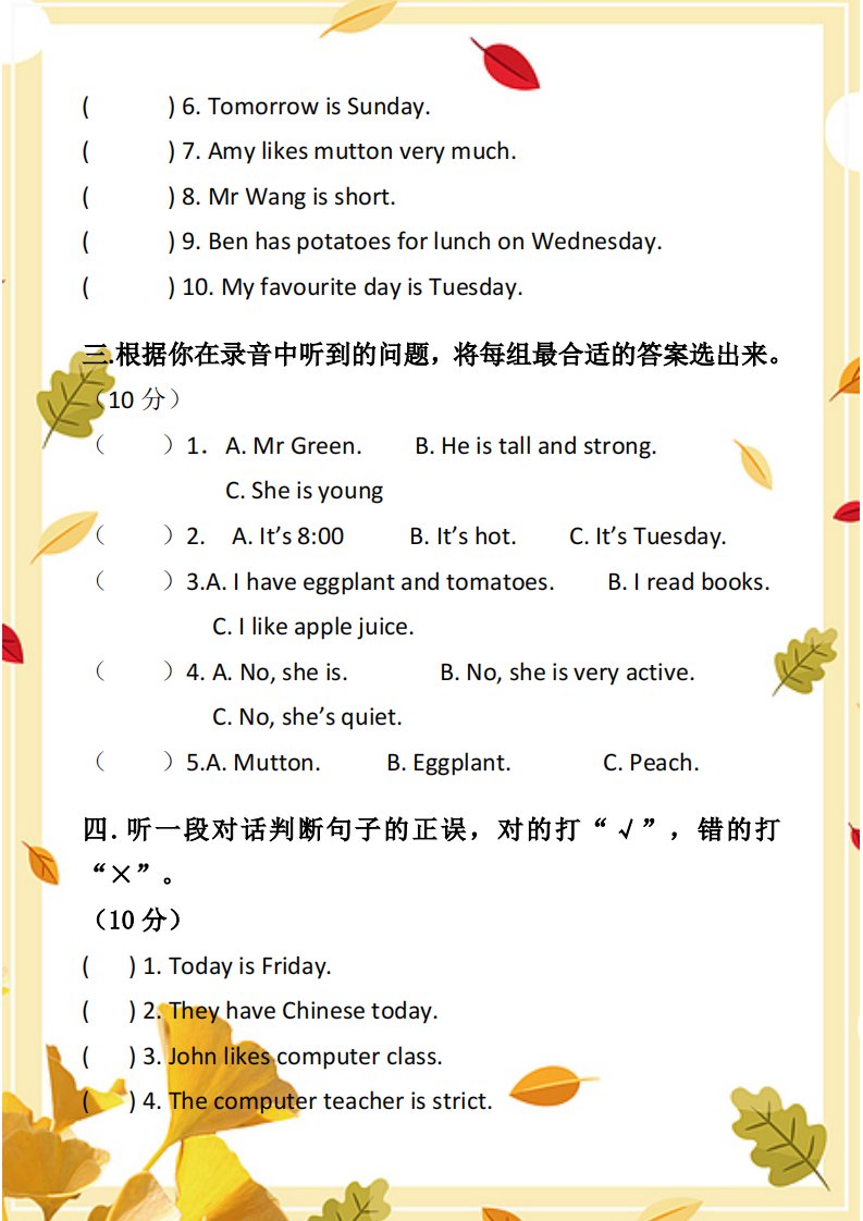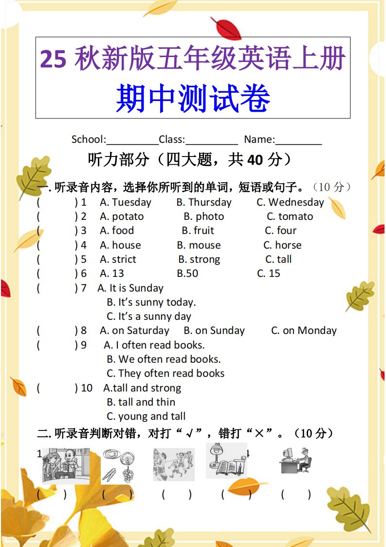 【2025秋新版】PEP五年级英语上册期中测试卷_共9页