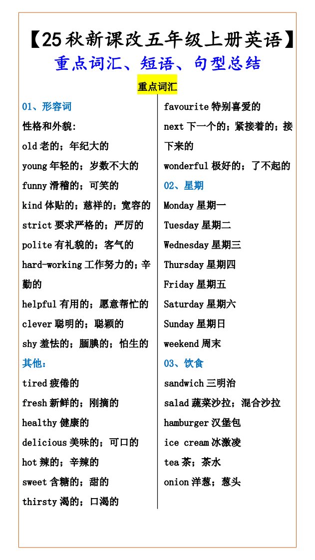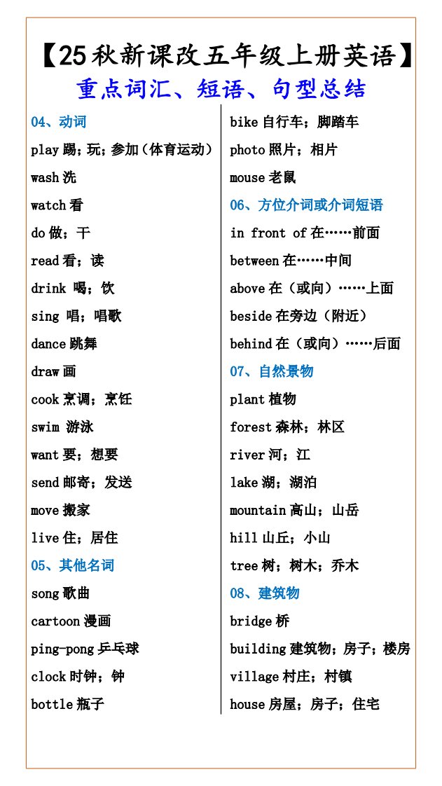当前位置: 首页小学资源小学五年级正文 【2025秋新版】【五年级上册英语】重点词汇、短语、句型总结_共5页 小学五年级 7 天前 0 0 5 以上为部分内容预览,如需源文档请登录您的会员账号进行下载! 声明:本站所有文章,如无特殊说明或标注,均为本站原创发布。任何个人或组织,在未征得本站同意时,禁止复制、盗用、采集、发布本站内容到任何网站、书籍等各类媒体平台。如若本站内容侵犯了原著者的合法权益,可联系我们进行处理。 尚学资源永久会员 打赏 收藏 海报 链接