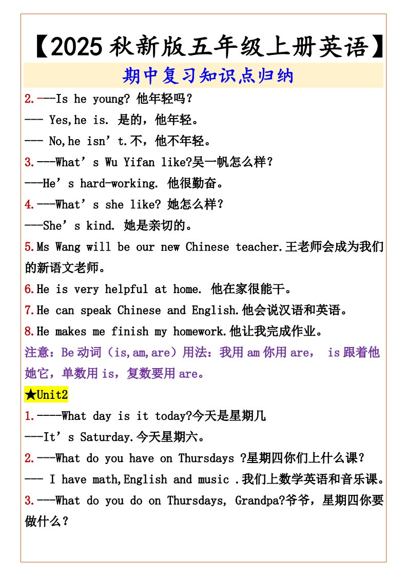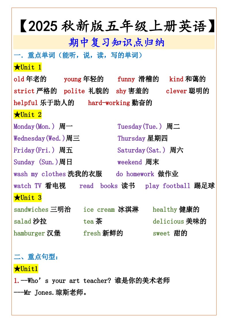 【2025秋新版】【五年级上册英语】期中复习知识点归纳_共3页