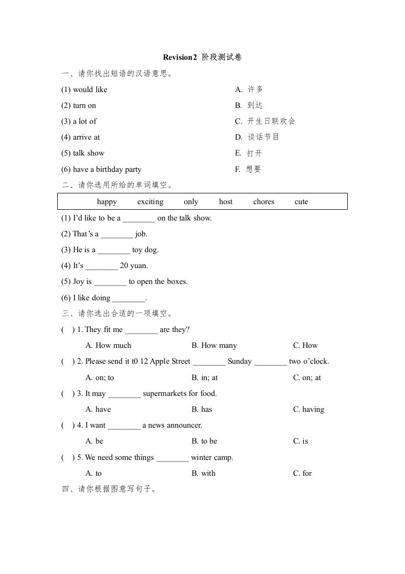 当前位置: 首页小学资源小学五年级正文 五年级英语上册Revision2_阶段测试卷(人教版一起点)_共4页 小学五年级 6 天前 0 0 5 以上为部分内容预览,如需源文档请登录您的会员账号进行下载! 声明:本站所有文章,如无特殊说明或标注,均为本站原创发布。任何个人或组织,在未征得本站同意时,禁止复制、盗用、采集、发布本站内容到任何网站、书籍等各类媒体平台。如若本站内容侵犯了原著者的合法权益,可联系我们进行处理。 尚学资源永久会员 打赏 收藏 海报 链接